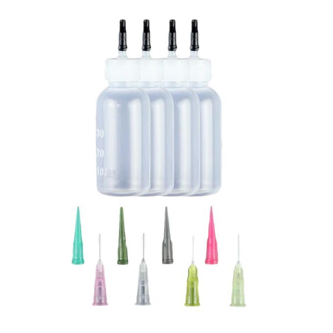 Package include 4pcs 30ml tip dropper bottle, 4pcs plastic trianglular tips(14G Olive Green, 16G Gray, 18G Green, 20G Rose Red), 4pcs soft tips(14G Green, 15G Light Green, 18G Light Gray, 20G Pink), 4pcs tips stopper caps.