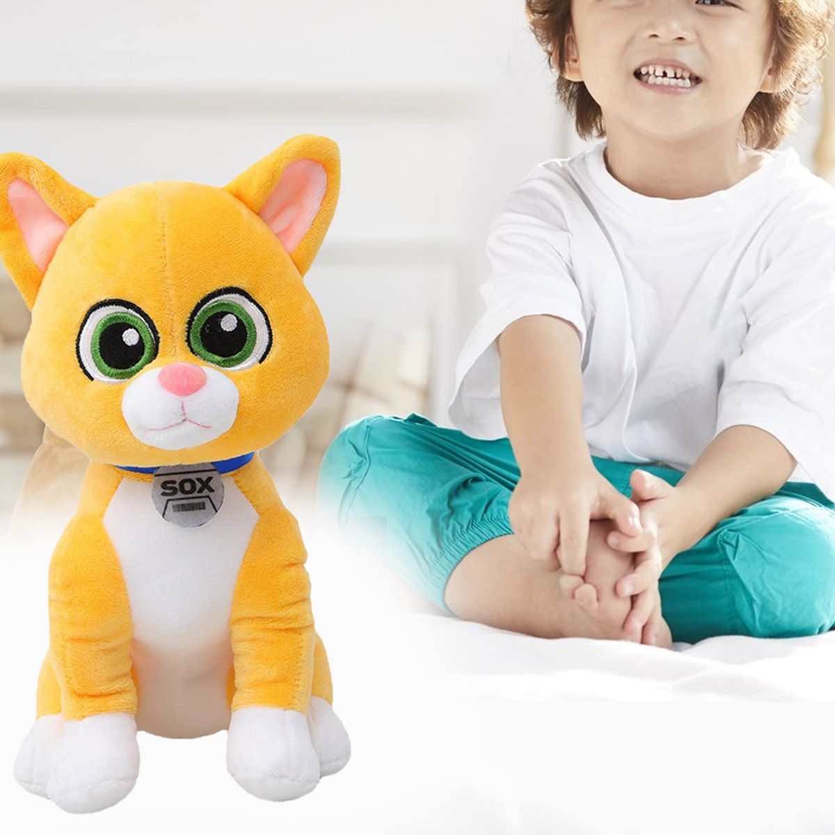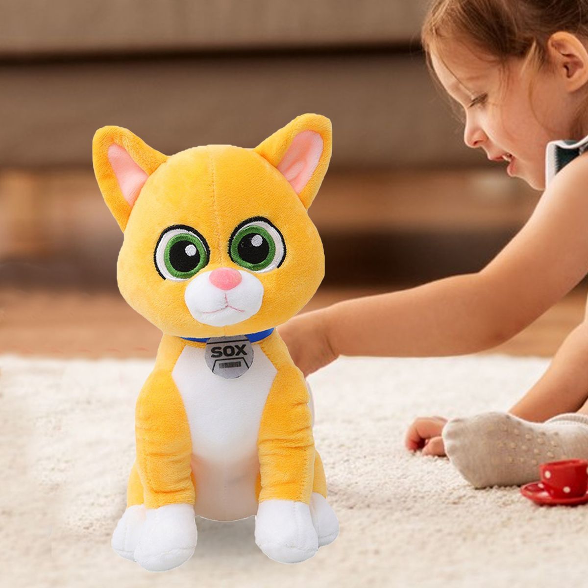 There is no doubt that it is inspired by the latest action movie figurecat, which wear the iconic SOX nameplate collar around his neck. big eyes lifelike talking, plush shape and cure yellow fluffy, round head is very cute.