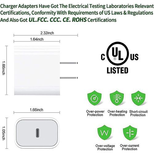 5. Safety UL Certified Charger -- 20W USB-C fast charger has multipotent safety system ensures complete protection for your lightning devices. Multiple built-in safeguards and intelligent IC identification technology protect against short circuit, over-current, over-voltage, over-heating and over-charging. Automatically stops charging when battery capacity is full to ensure your device safety and long lifetime.