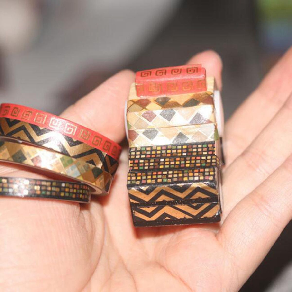 26 ROLLS LOVELY PATTERNS: These Washi tapes have 26 Roll different colors and patterns. Lovely, vibrant and bright colors.They are simple but delicate.DIMENSIONS:Each roll of tape is 3mm / 0.12inch wide and each roll is 3m / 118inch long.MATERIAL: made of high quality Natural Fibers Washi Paper material, they are non-toxic and .SELF-ADHESIVE: The tapes are self-adhesive,easy to tear off and stick.You can tear them off by hands,no need for scissors.And they can be removed easily,leaving no or residue on walls or furnitures,easy to use.MULTIPLE PURPOSE:Great for kids, teenagers and adults to use.You can use the washi tapes to decorate your DIY crafts, art projects, journals and scrapbook and so on; you can also use them to frame computer monitors, keyboards and wrap pens and gifts.Use these washi tapes to make them more beautiful and fashion.