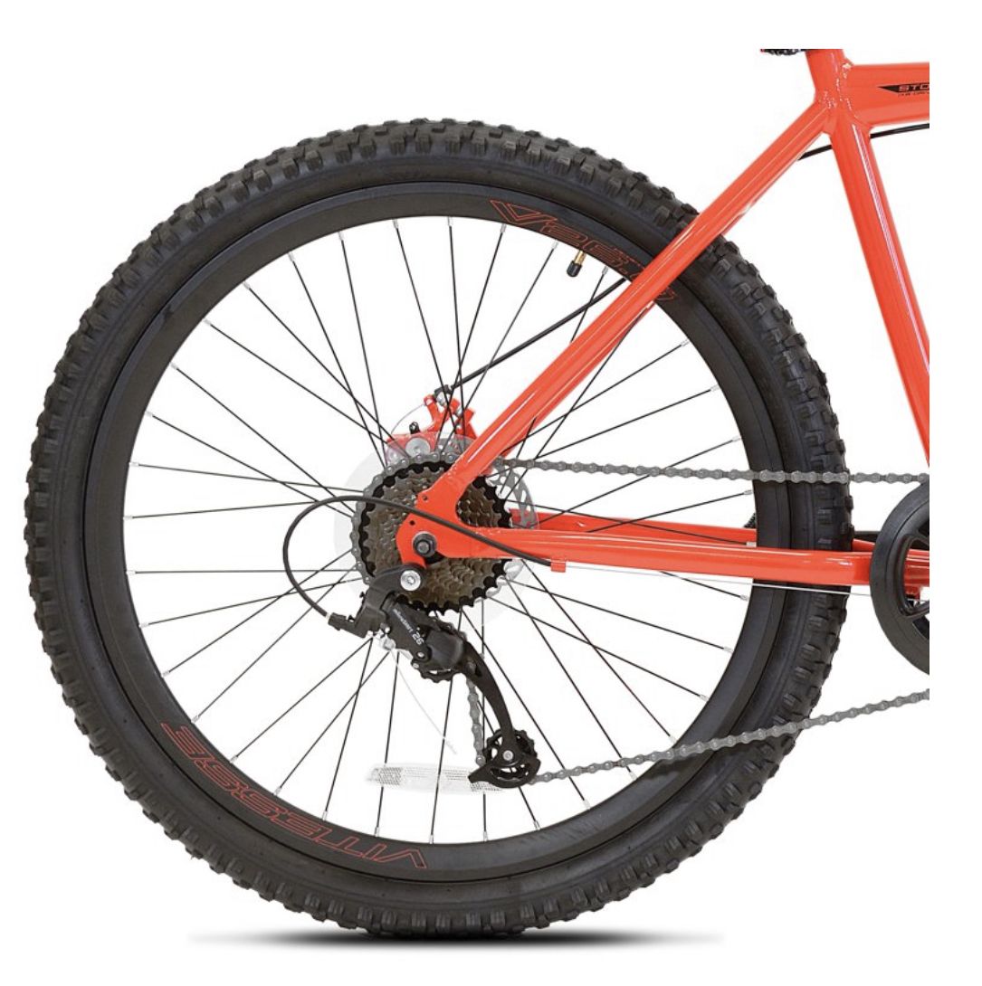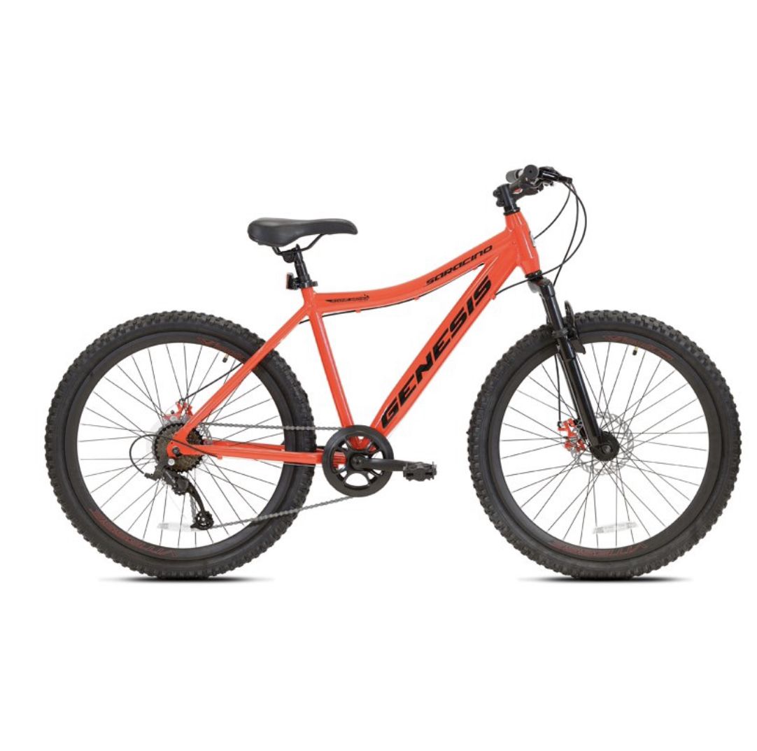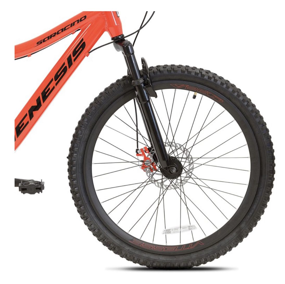 The Genesis 26" Saracino is a no-nonsense hardtail mountain bike with all the features you need for street and trail. A custom oversized aluminum frame with a Vitesse suspension fork handles bumpy terrain with finesse. The 1 x 8 drive train will get you up and down all the hills with light action shifting and a MicroShift 26 rear derailleur. When things get a little hairy, the Saracino has all the stopping power you need courtesy of front and rear cable actuated disc brakes. Comfort comes your way with a padded saddle that is easily height adjusted with a no-tool quick-release seat-post clamp. Whether you are riding on the street or on the trail, the men's 26" Saracino mountain bike from Genesis has you covered.