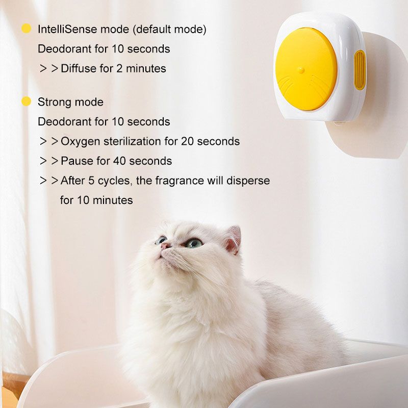 Description Product: Cat Deodorizer Machine Size: 82*85mm Battery capacity: 2600mAh Material: ABS+PP Working voltage: 3.7v Rated power: 3w Input: 5v 1A Working mode Normal version: 1. Enter the powerful deodorization mode ar turning on the machine, sterilize for 20 seconds, pause for 40 seconds, ar 5 cycles, diffuse the fragrance for 10 minutes, this proce lasts for 1 hour. 2. Ar 1 hour, enter the intelligent induction mode, when the cat leaves, deodorize for 10 seconds and diffuse for 2 minutes. When the cat comes, stop working. APP version 1. the default is to work in normal mode 2. You can connect to the mobile app via Bluetooth, adjust the time and intensity of deodorization and fragrance diffusion, and customize the deodorization plan. Features 1. Ar the machine works, it releases ozone ions, 99% of the sterilization and deodorization function. 2. The product has a strong deodorant mode and an intelligent induction mode. When entering the intelligent induction mode, the cat comes, the product stops working, and the cat goes away and starts to work. 3. 2600mah charge for 4 hours, can be used for 10 days. 4. Can be used to sterilize cat litter boxes and toilets. 5. Use 100% plant eential oil fragrance tablets, non-toxic and non-irritating, if you don't like fragrance tablets, you can choose not to use them. Package include 1 x Cat Deodorizer Machine
