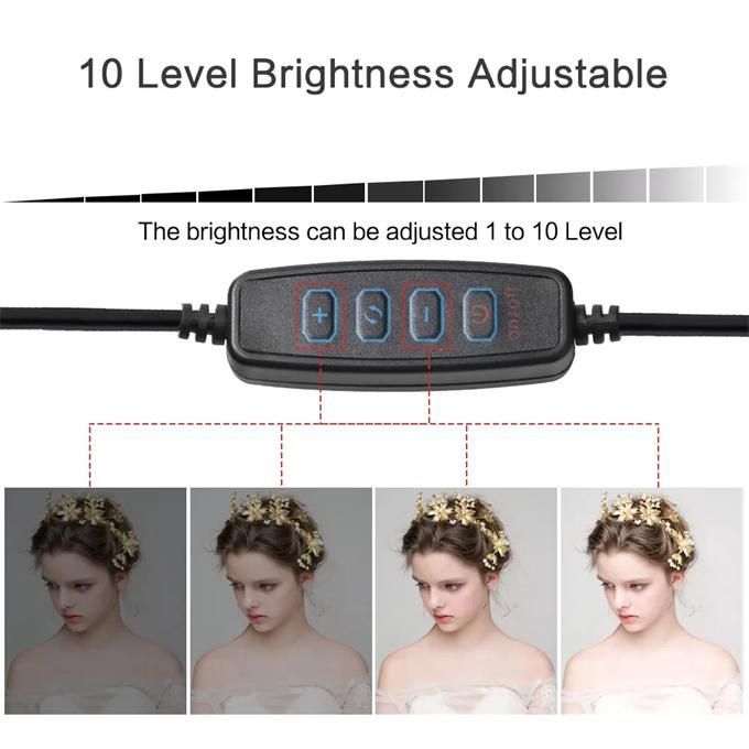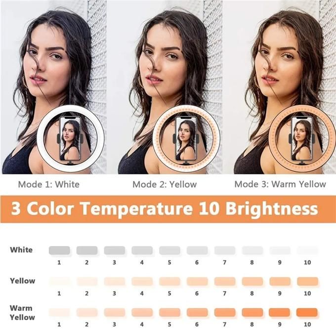- -3 color LED ring light working modes: white, warm yellow, warm white. Each light mode has 10 levels of adjustable brightness to meet your different needs