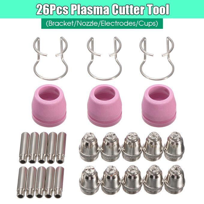 The 26pcs PL60 plasma torch accessories kit includes 10 conductive nozzles, 10 electrodes, 3 porcelain nozzles and 3 brackets, easy installation and perfect fit.