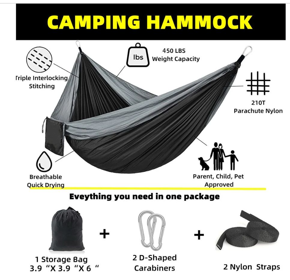 【 Easy Set Up】: Our Camping Hammock is equipped with 2 Tree Straps , 2 Steel Carabiners. You can attach the straps to anything sturdy like a tree or pole and adjust your hammock to your desired height and comfort level.