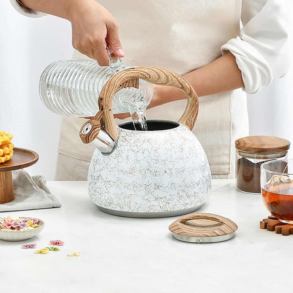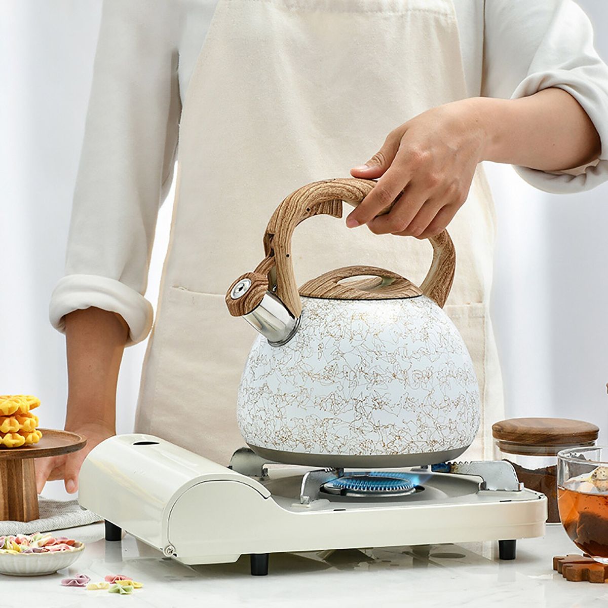 Features: 1、High Quality: This tea kettle is made of profeional anti-rust coating and stainle steel technology, high temperature and corrosion resistance, to ensure the anti-rust performance of the stove tea pot. The high-quality foorade stainle steel can not only withstand dents and scratches, but it can also be used for a long time without any probl. 2、High Safety: Your safety is our main consideration. Therefore, the lid and handle of our stove top kettle are made of heat-resistant materials with a comfortable feel, and there is no need to touch any metal parts during use. A simple touch on can easily open and close the lid, ensuring that you can stay away from heat and steam while in use, ensuring your safety. 3、Large Capacity: The 2.8L large capacity stove tea kettle saves your time and energy, suitable for family use. The larger opening makes it easy to fill the stove top tea pot. The unique design of the opening angle of the spout can not only open the lid and fill with water, but also quickly fill with water through the spout. 4、Loudly Whistle: When the water is boiling, the whistling kettle will automatically emit a whistle, so you can hear a unique and loud whistle. When you are focusing on other iues (such as housework, watching TV or games), the whistle on the kettle will attract your attention. Time-saving, simple, and stre-free. 5、Exquisite Design: Stylish and simple design. The high-quality stainle steel tea kettles are also easy to clean and keep shiny. Whether it is used or placed, it will be a beautiful scenery to decorate your kitchen. Specifications: Name:LinePatternWhistlingPot Material:foodgradestainleteedwoodgrainnylonhandle Capacity:2.8L Packinglist: 1xTeaKettle