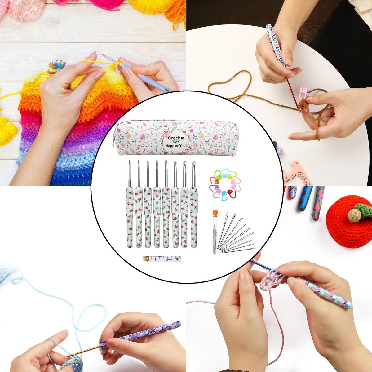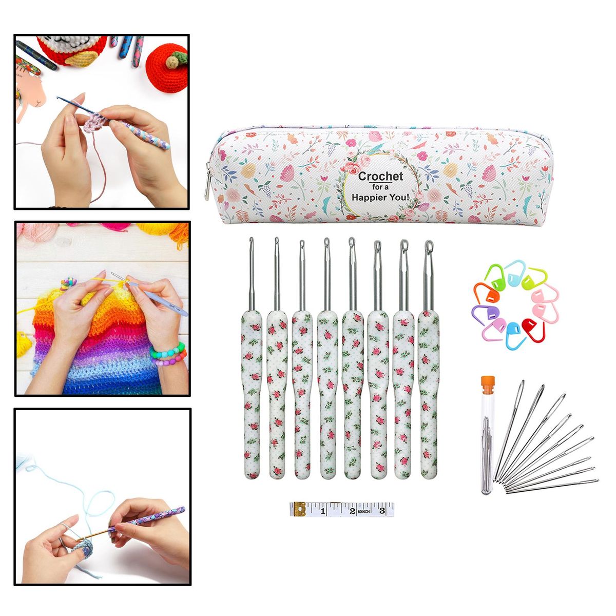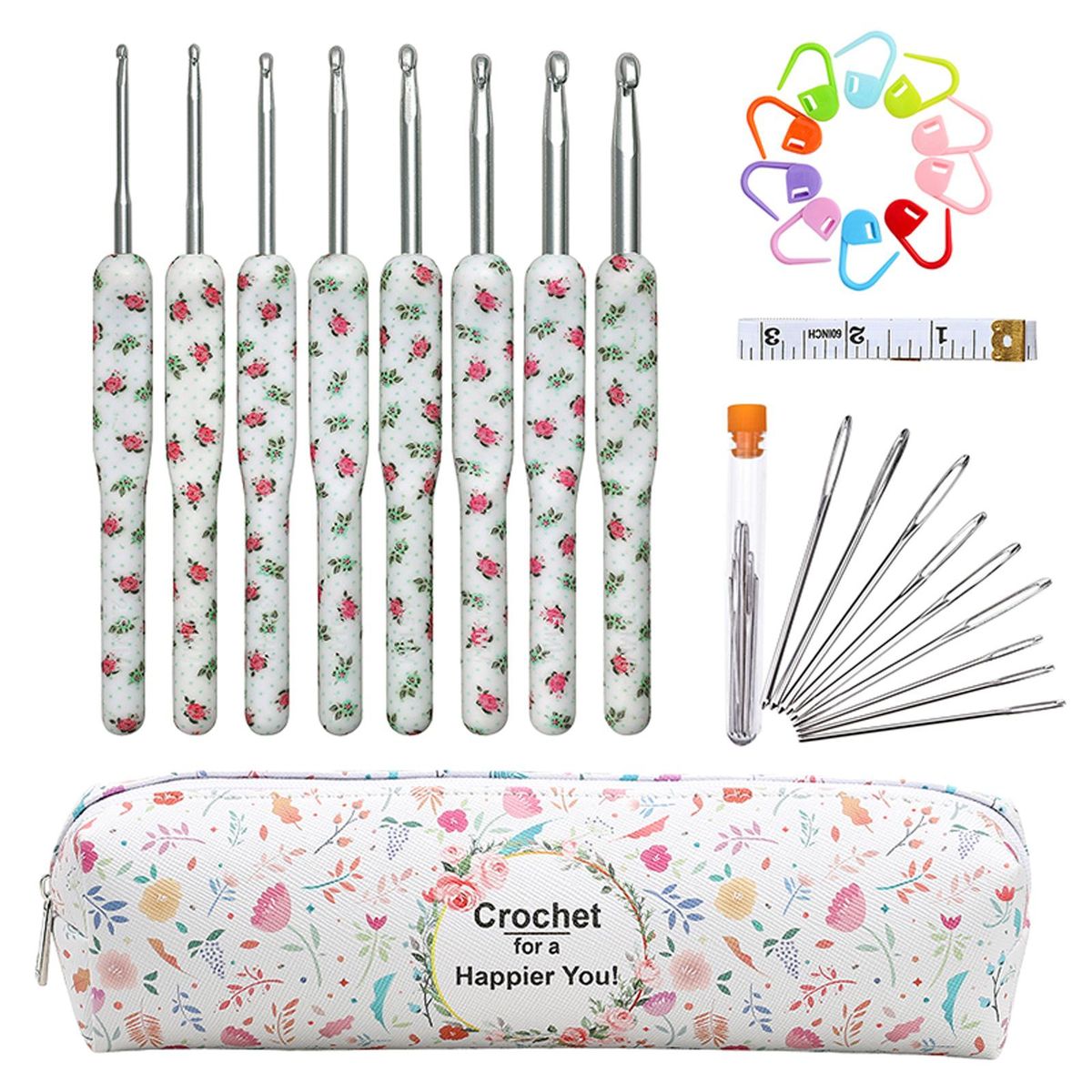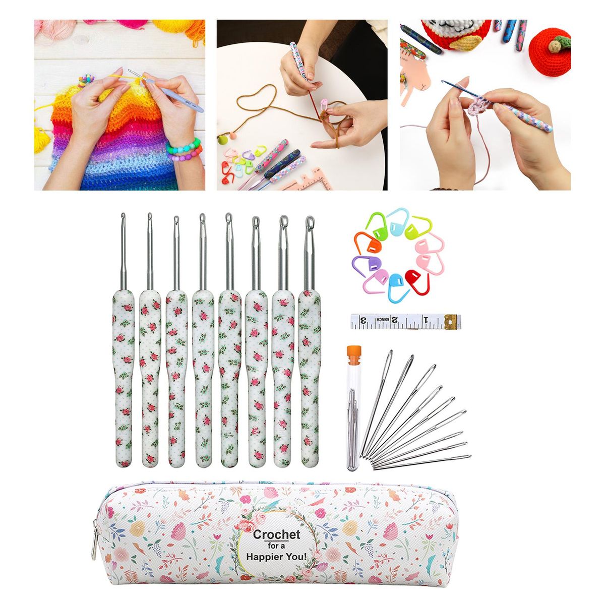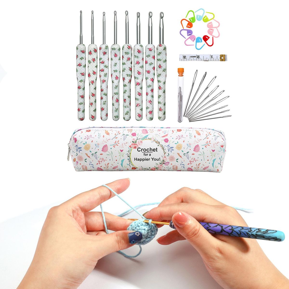 Package includes: 8pcs crochet hooks; 9pcs yarn (with bottle); 10pcs stitch markers; 1pcs and 1pc storage bag.