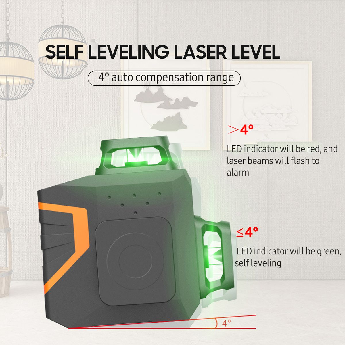 2D Cross Line Laser Level: With 360 deg; horizontal and 360 deg; vertical green beams, 30m/ 98ft working range and 4 deg; self leveling function, the laser level is suitable for the layout of tile work, banister hanging, shelving installation and more work scenarios in construction site, home decoration/ improvement, etc.