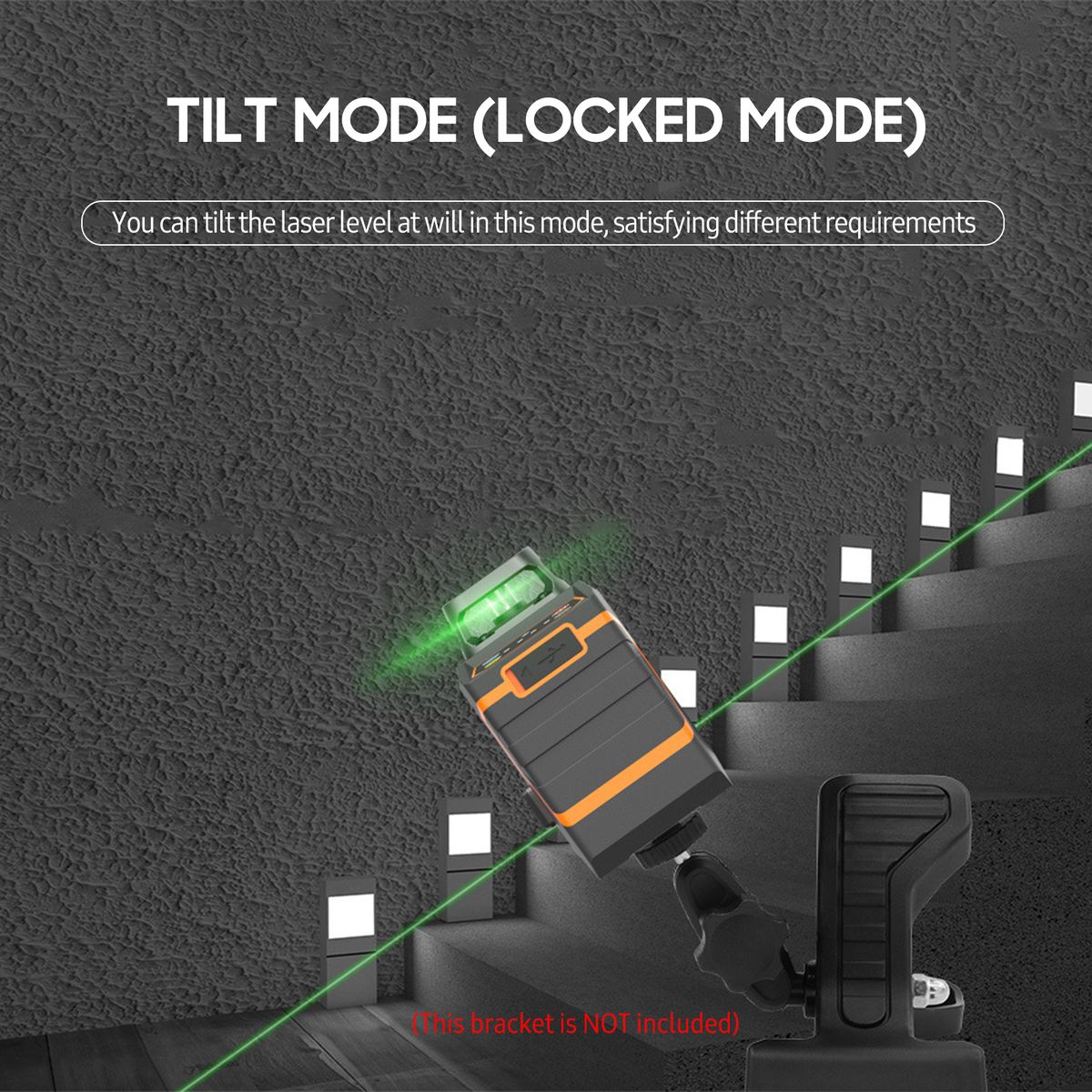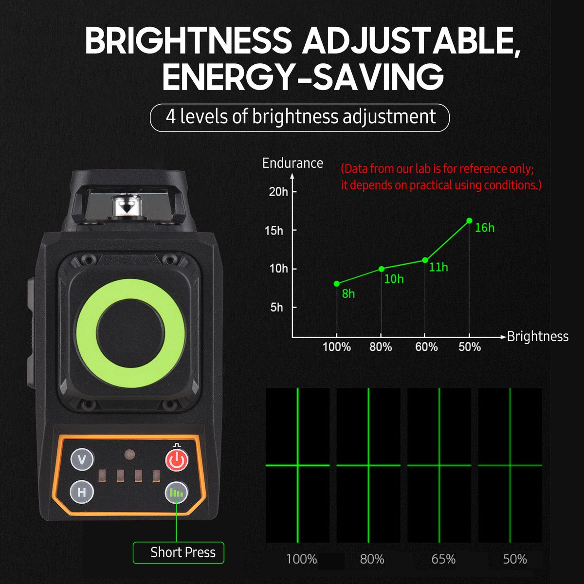 4 Working Modes: Self-leveling mode -- vertical and horizontal laser beams light up; locked mode -- vertical and horizontal laser beams light up and flash every 5s; energy saving mode -- 4 levels of brightness adjustment; pulse mode -- for long range use, can work with laser receiver (not included).