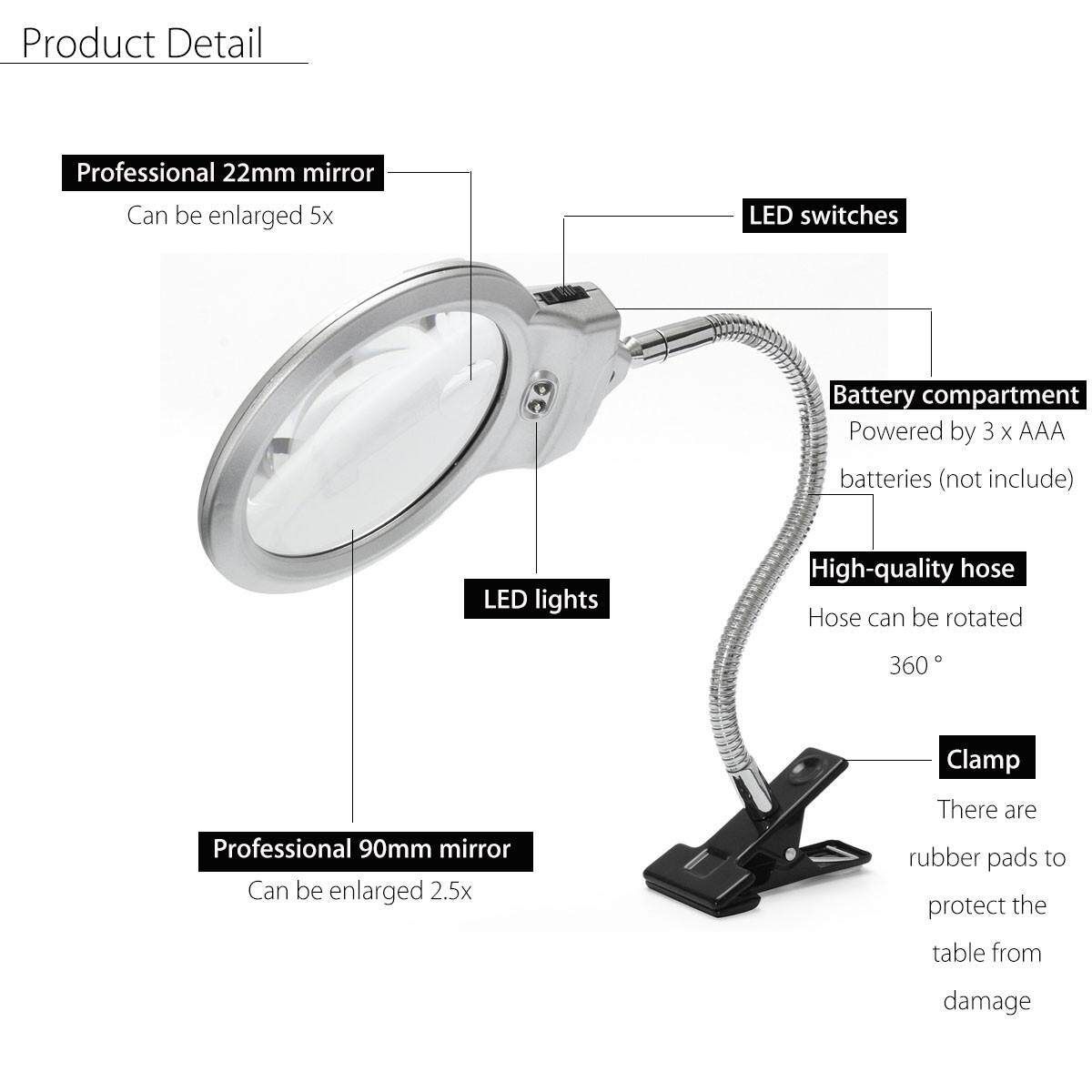 -This magnifier's lens is designed with frame,so that the lens can be not fraied,an be used long time.this magnifier is an ideal tool for people who are involved in fine work such ascoins,stamps,jewelry,embroideries anad son on.with two led illuminating lamps,it can also be in normal operation under insufficient sunlight environment.