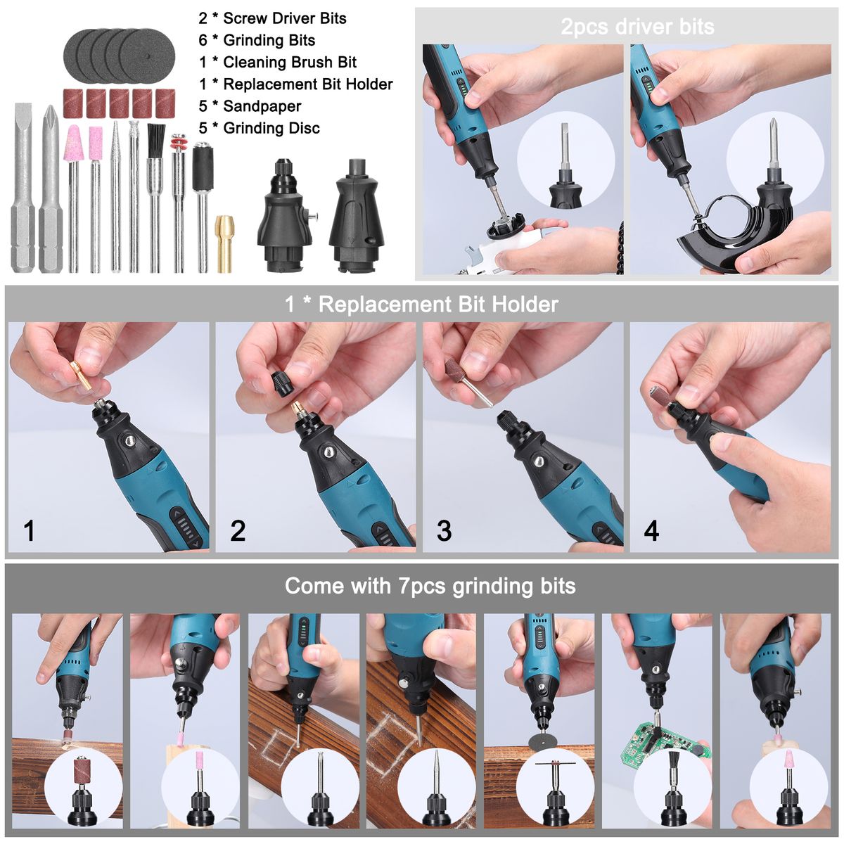 Come with 7pcs grinding bits and 2pcs driver bits to meet your various repairing needs.