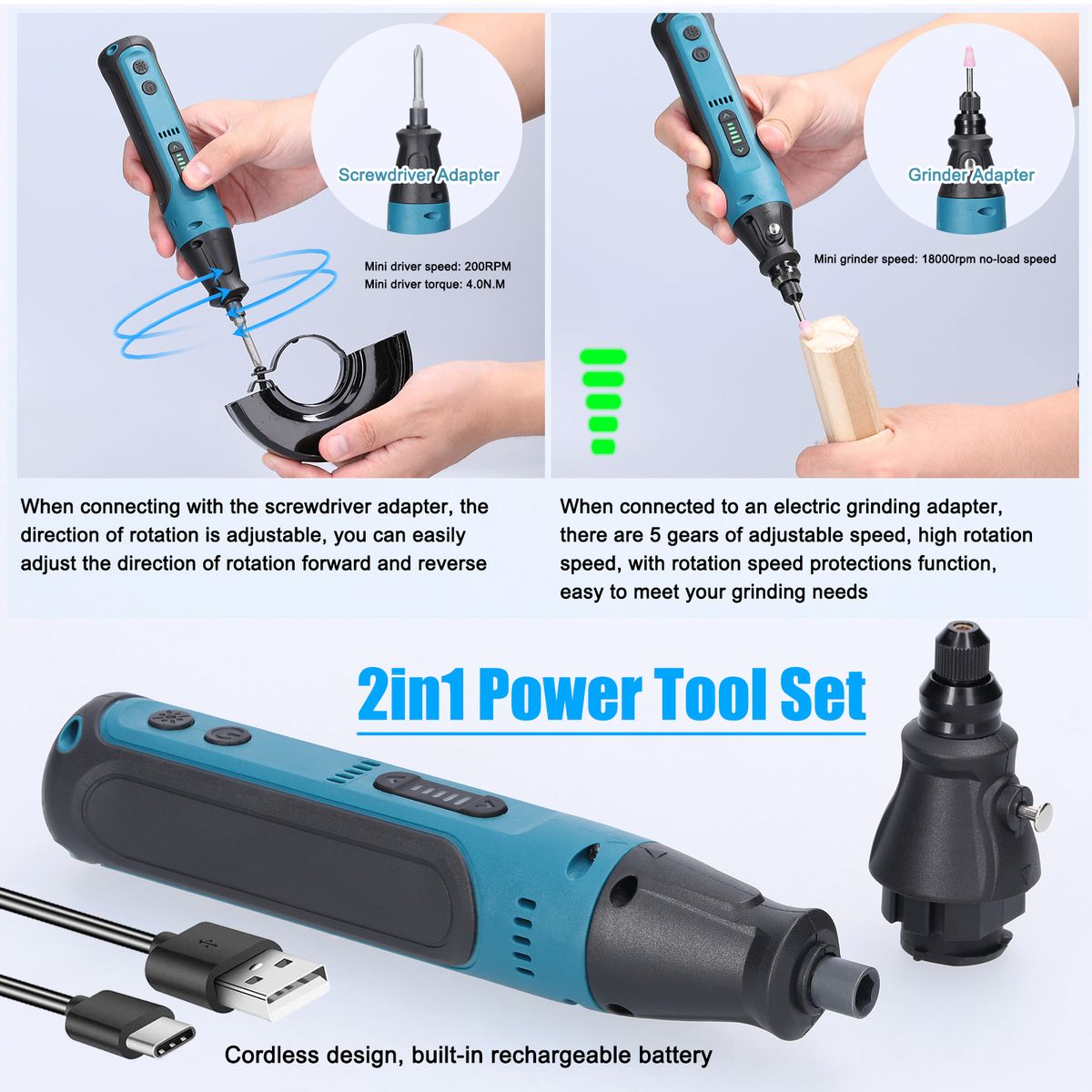 The 2in1 design tool comes with two adapters to convert into a mini screwdriver and electric grinder.