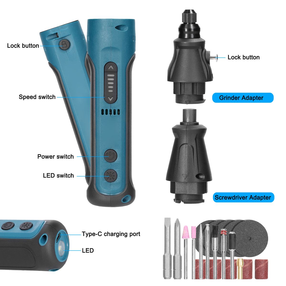 1 x Tool Host,1 x Screwdriver Adapter,1 x Grinder Adapter,2 x Screw Driver Bits,6 x Grinding Bits,1 x Cleaning Brush Bit,1 x Replacement Bit Holder,1 x Type-C Cable,5 x Sandpaper,5 x Grinding Disc,1 x English Instructions