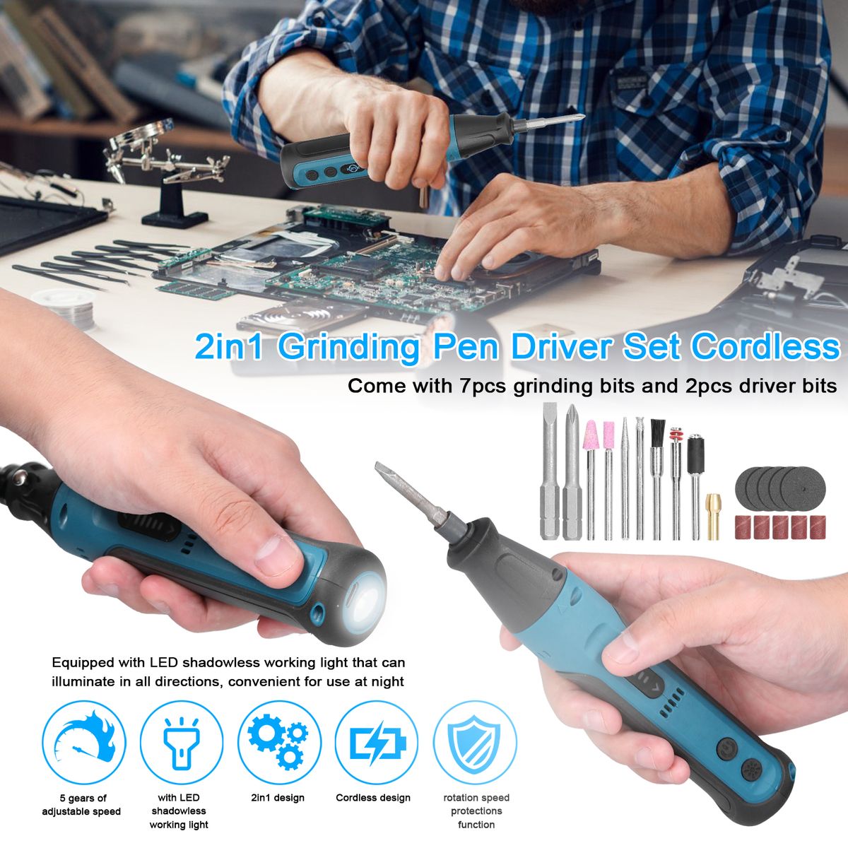 The 2in1 design tool has two adapters to convert it into a mini screwdriver or an electric grinder. Come with 2pcs precise driver bits and 7pcs grinding bits to meet your various repairing requirements. Cordless design, built-in re-chargeable battery, Type-C re-chargeable interface, economic and eco-friendly. Equipped with an LED working light that can illuminate in all directions and is convenient for use at night. Come with 7pcs grinding bits and 2pcs driver bits to meet your various repairing needs.