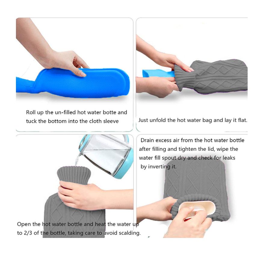 Do not use boiling water when filling hot water bottle.Screw the stopper tghtly to ensure no leakage.Do not lie or sit on top of it.When not in use, empty the bottle and allow to dry in cool dry place |