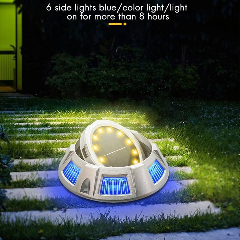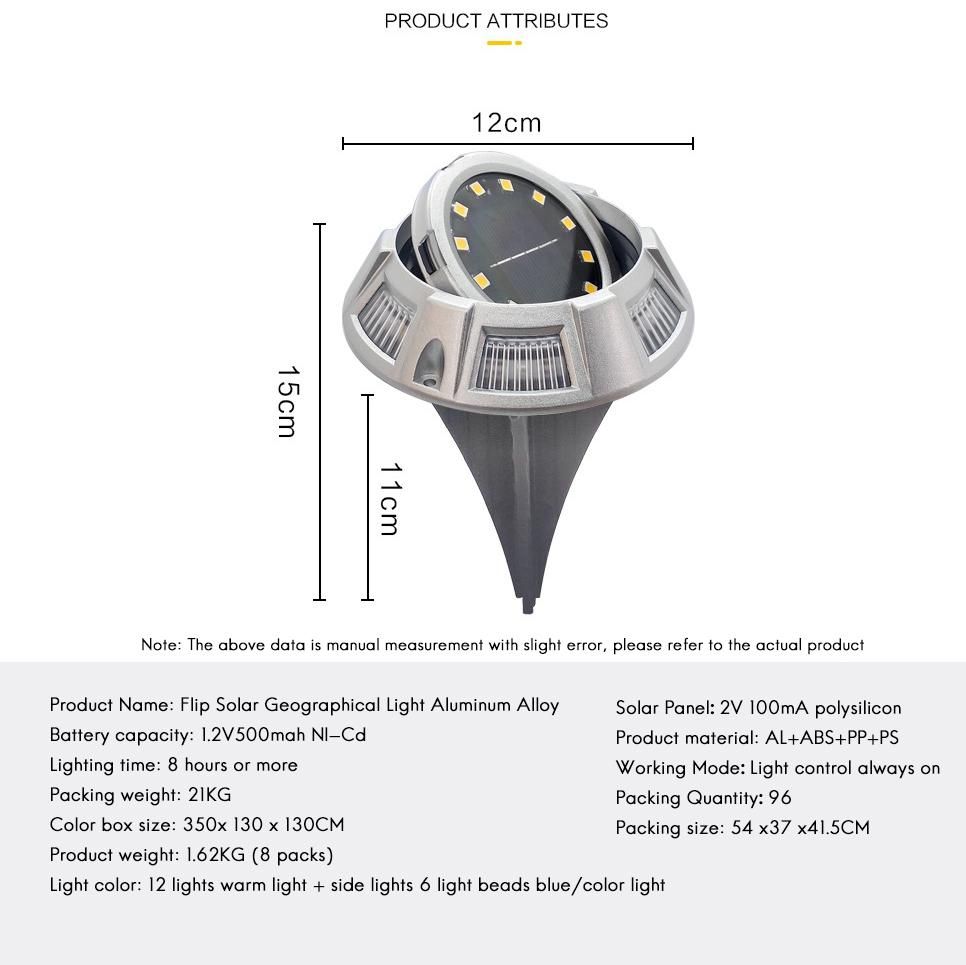 SOLAR POWERED LIGHTS Our upgraded solar ground light is consists of 8 warm LED, 4 sides blue lights with a built-in 600 mAh battery.It is equipped with the switch to control the power of charging and storing.Make good use of solar energy,save your money.