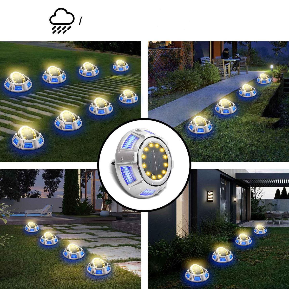 WATERPROOF & DURABLE The solar disk lights are IP65 waterproof can withstand outdoors terrible weather.These are made of durable ABS material. The solar will never get rust.