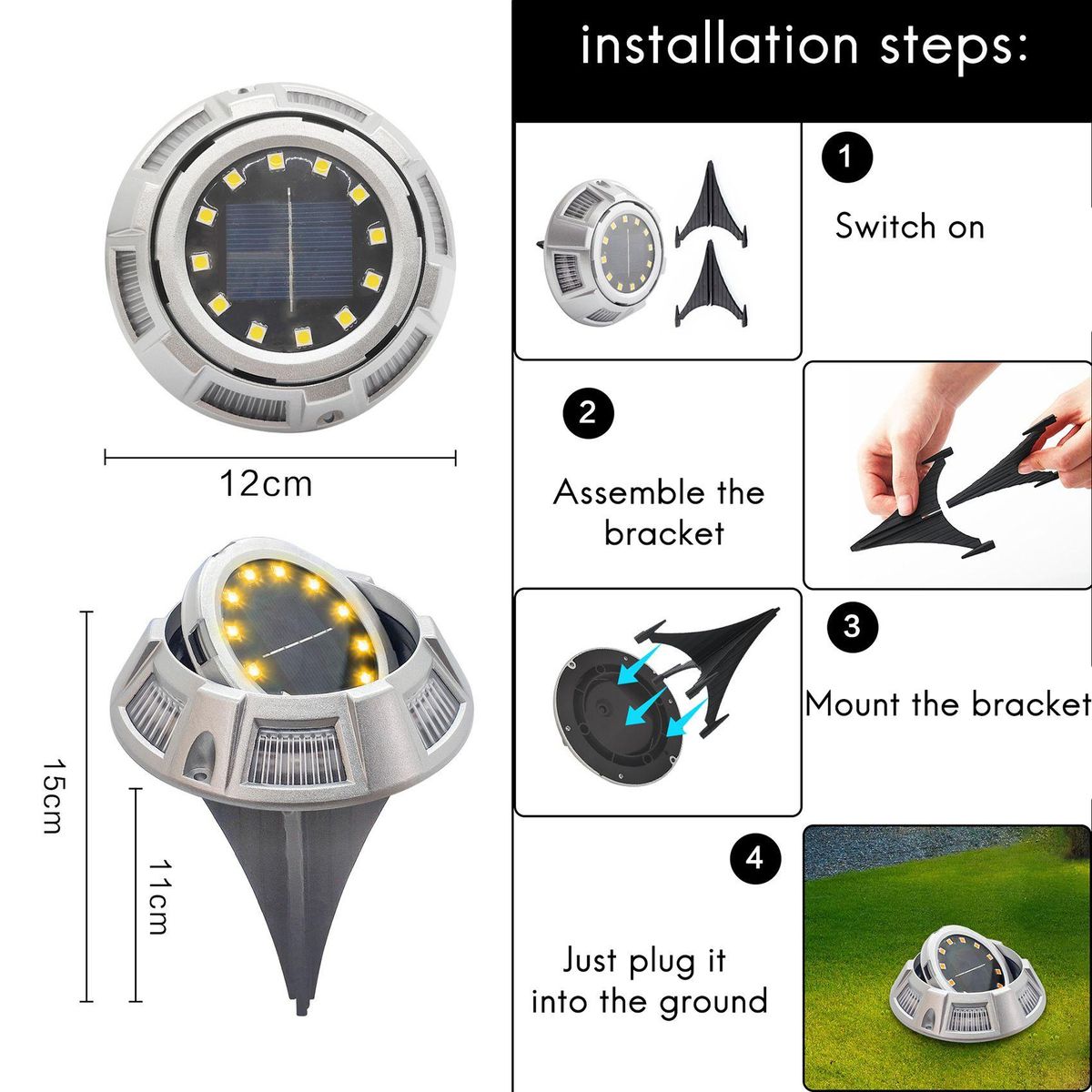 BRIGHT SOLAR GARDEN LIGHTS The rechargeable solar in-ground lights brightness is up to 40lm.It just needs 6-8 hours to be fully charged and last for 8-10 hours working time. Make your yard light time more longer.