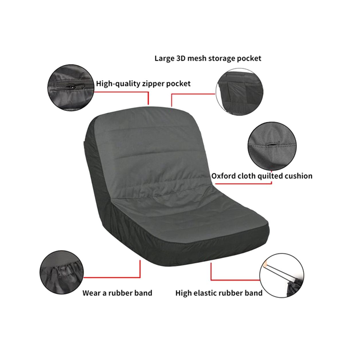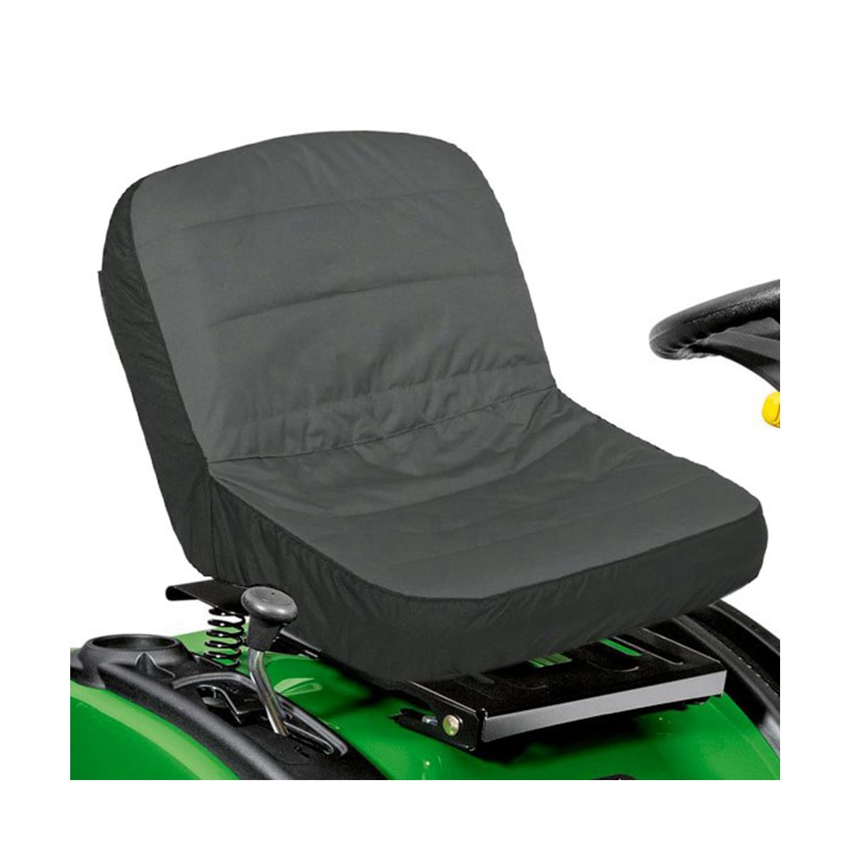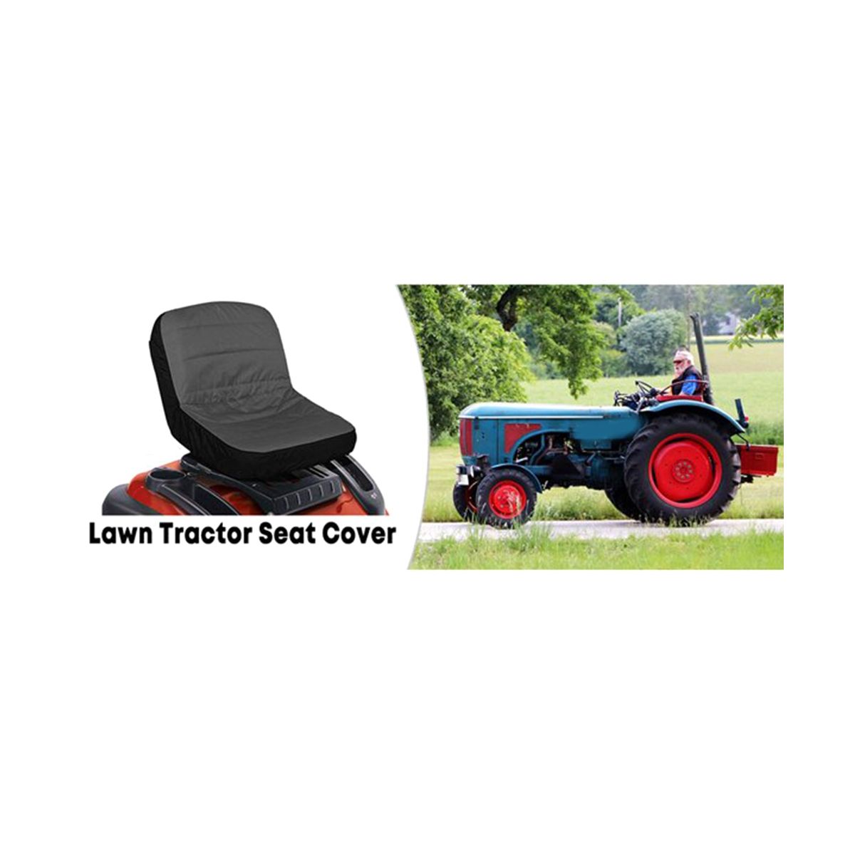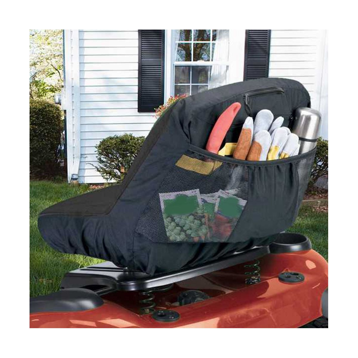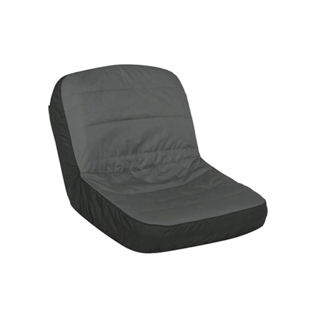 Deluxe Riding Lawn Mower Seat Cover. This seat covers provides water-resistant coverage to new seats and makes older seats look and feel new again. The tractor seat cover features a cushion providing extra comfort. a snug fit is easy with an elastic shock cord in the bottom for a quick, custom-like fit. Seat back cover features handy tool and gear pockets.