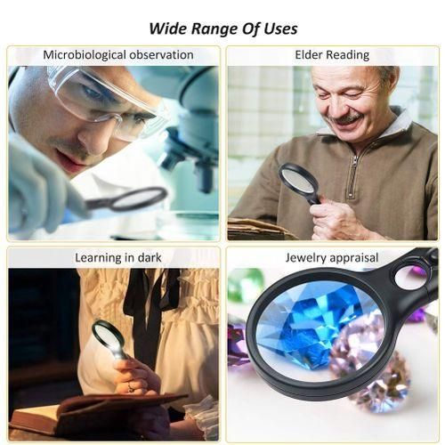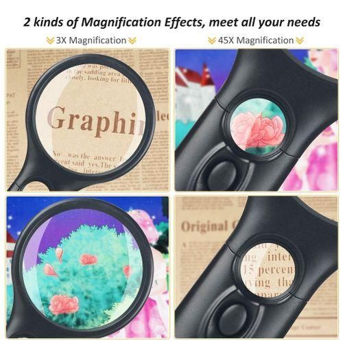 Your affirmation is our greatest motivation ! ! ![HD Multiple Lens]: This magnifying glass with light has 3x and 45x all-optical glass lenses, independent high-magnification magnifying glass lenses, which can identify smaller items and provide excellent high-definition images and text. Moreover, the hard scratch-resistant lens can be used for a long time. At the same time, our handheld magnifier comes with lens cleaning cloth, which you can use to wipe the lens to keep the lens in a bright and clean environment.
