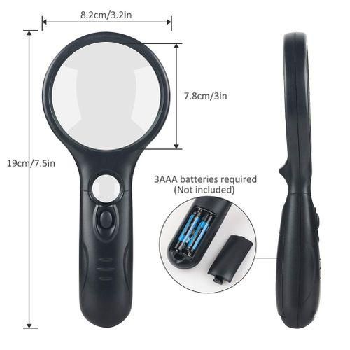 [Easy To Use]: The handle of the magnifier is designed with ergonomics and feels comfortable. One button to switch ON/OFF controls the LED light. Just prepare 3 new AAA batteries (not included), press the battery cover to open the battery compartment, and close it after replacing the batteries. Once a new battery is added, the magnifying glass with light will work.