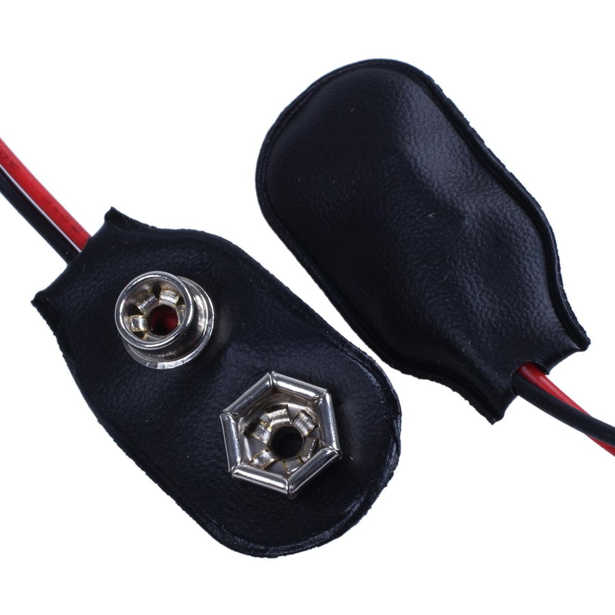 9V wired clip battery connector, features faux leather shell, 2-wire connector, black red in color.