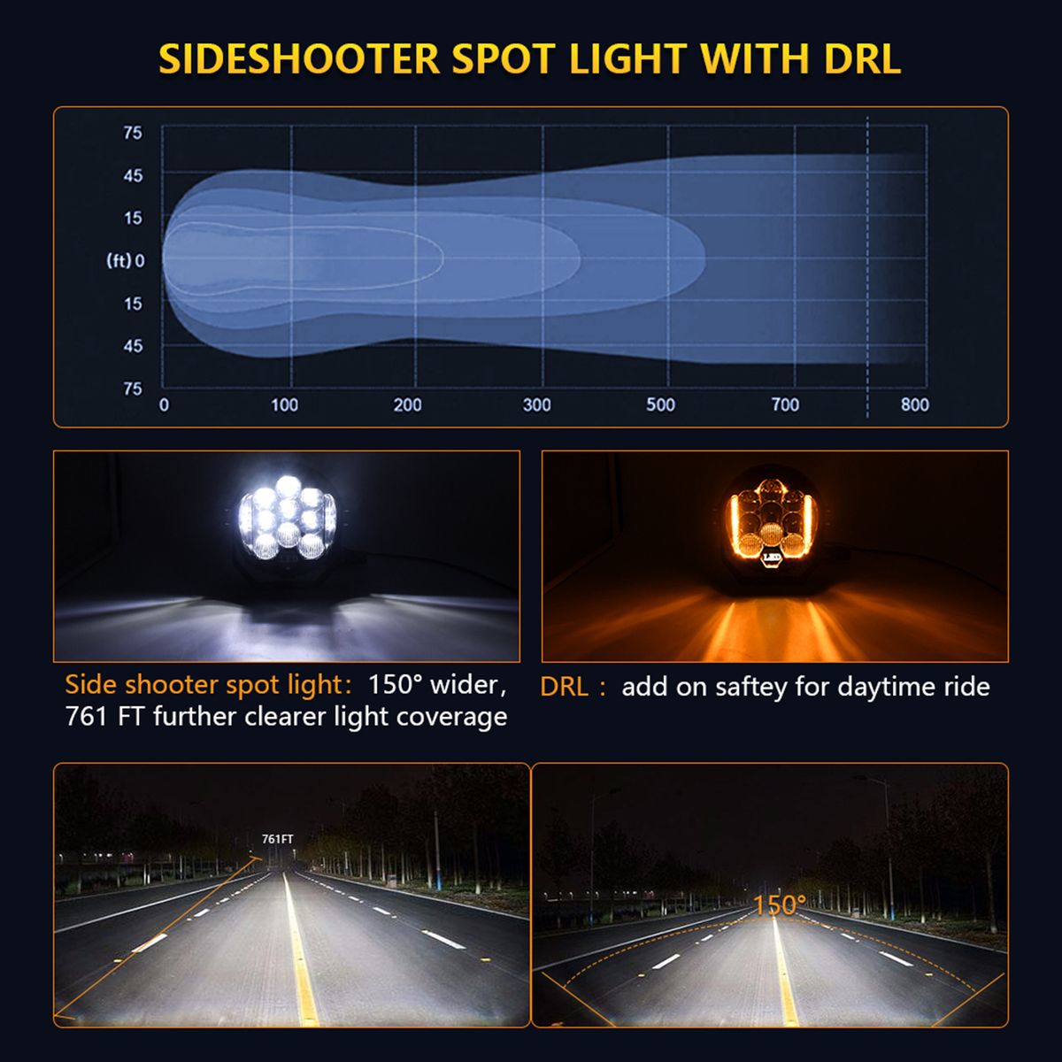 Dual Side Lamp Design: The dual side lamp design is adopted to shoot more light coverage of 150 deg; and 761FT, improving your driving safety.