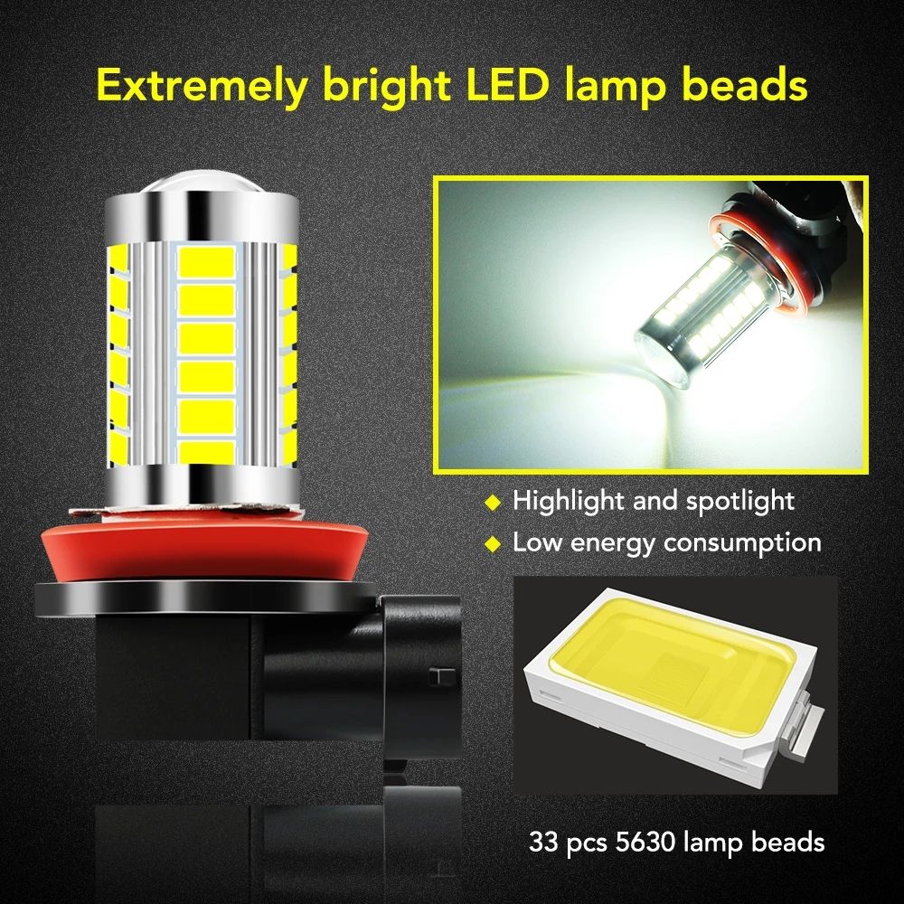 Specifications:Voltage: DC 12VPower: 3WSocket: H8 H11lumen:600LM/bulbLED chip: 33pcs * 5630 LED chipsColor: WhiteColor temperature: White Life Time: about 50, 000 hoursTop QualityEasy to InstallLong service life time.Scope of use:Car fog lights bulb,tail lights bulb.