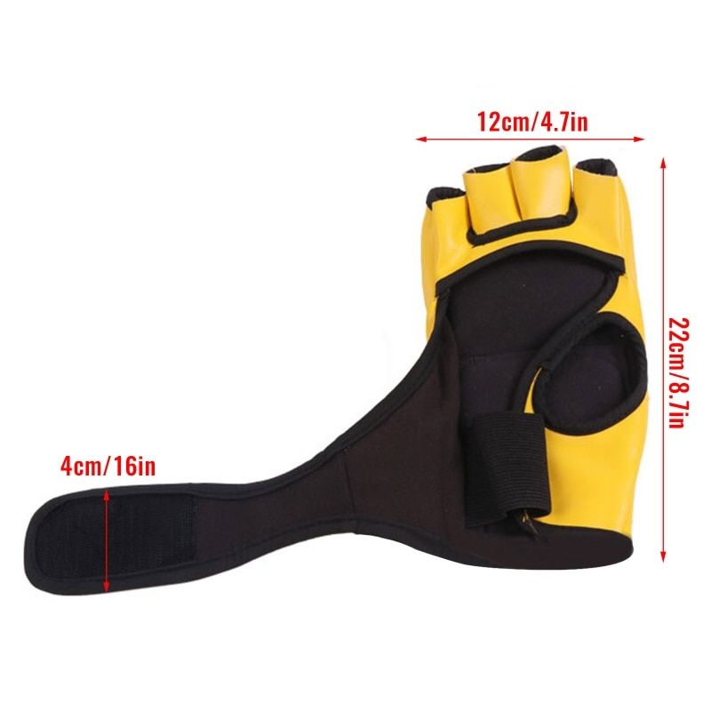 2Pcs Half-Finger Boxing Glove Training Gloves Kickboxing Gloves for Adults T4MF OOTDTY Features: and high quality Half-Finger boxing gloves are made of high-quality premium PU leather, buffer sponge, High foaming PE, multi layers of protection. The MMA gloves With perforations on the palms for increasing breath ability to make you feel cool, you will not sweat or feel hot during the training proce. The half finger boxing gloves are ideal for taekwondo, kickboxing, grappling, boxing, martial arts, sparring or any other lightweight daily training etc. The wristbands of it can be customized to ensure a comfortable fit. While providing solid wrist support, to protects your fist during intense training. These punching bag gloves constructed with an ergonomically-improved pre-curve design. Strong grip and not easy to rip. One MMA gloves' size fits most hand but not for everyones' hand. Adjustable wristbands for customized comfort fit. Specification: Material: PU Leather Color: Black/Yellow/Red/Blue Package Weight: approx.160g Size: approx.22x12x3.5cm/8.6x4.7x1.3in Package Includes: 1 Pair of Boxing Gloves note: Please allow 1-2cm error due to manual measurement. pls make sure you do not mind before you bid. Due to the difference between different monitors, the picture may not reflect the actual color of the item. Thank you!