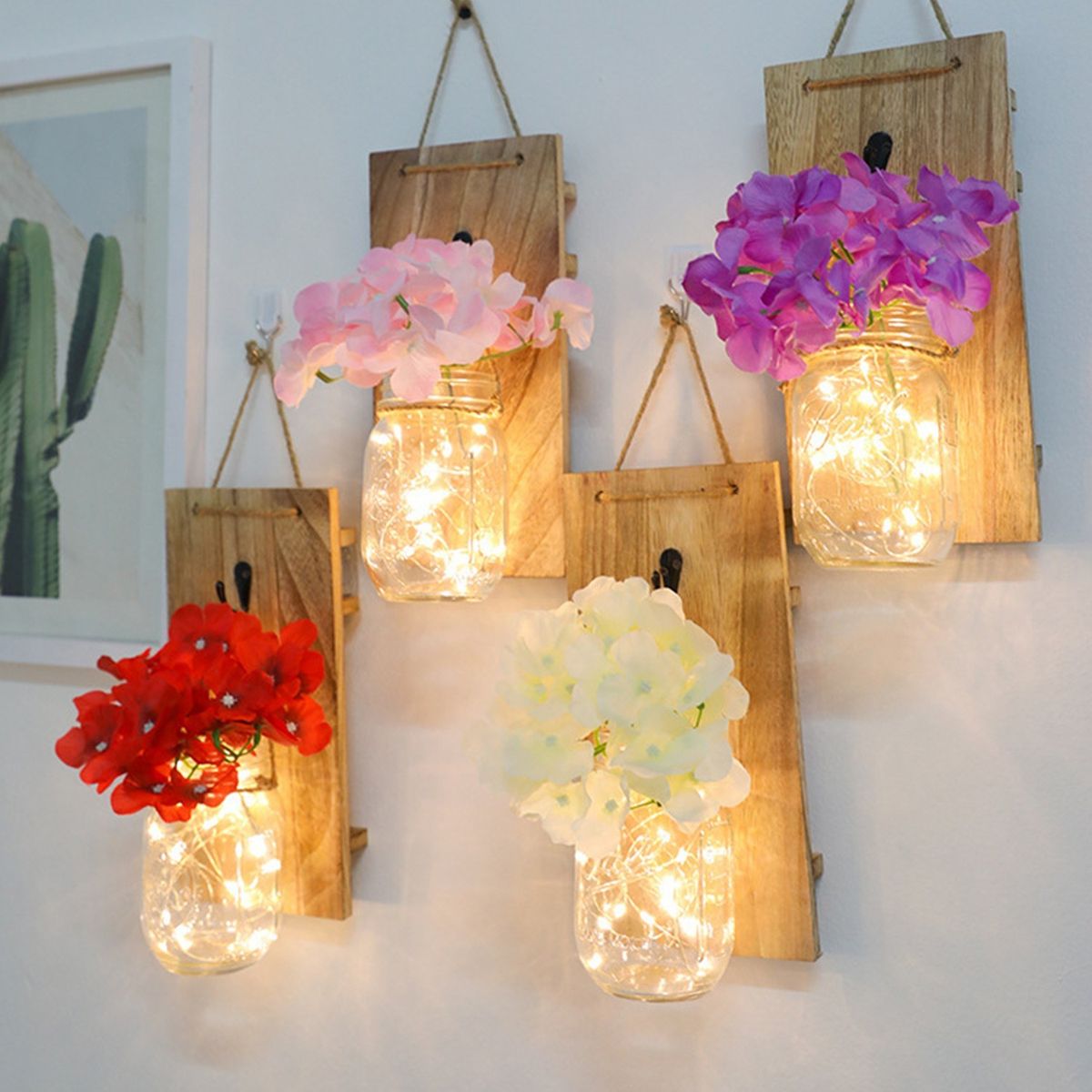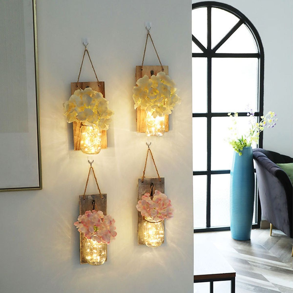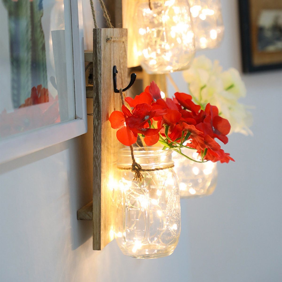 [Great Decorations]A pair of Mason jars fitted with stunning fairy lights on the inside these jar wall sconces look great in your living room.