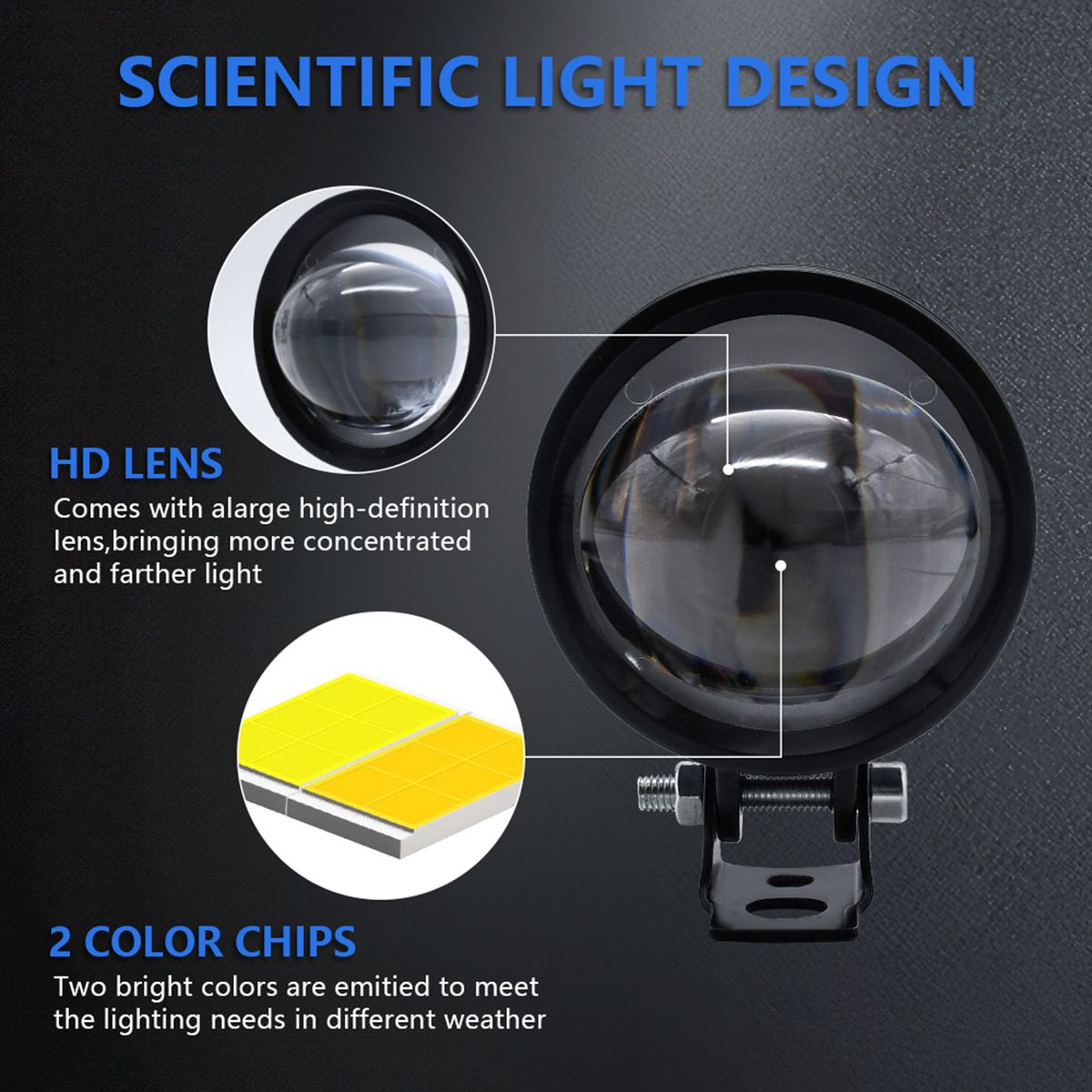 White Light/Amber Light/Two-color: The color temperature of the strong light is 6000K white light and 3000K amber light, which can meet the diversified driving requirements in rainy and foggy days or normal weather and make your driving more comfortable.