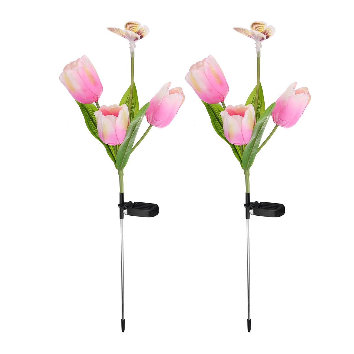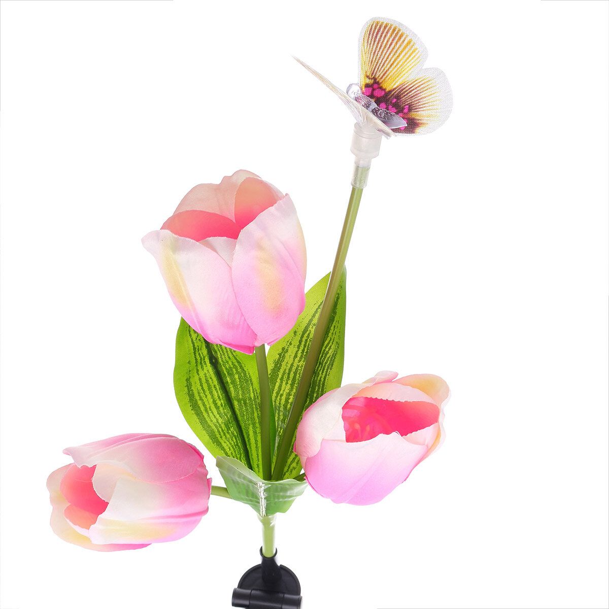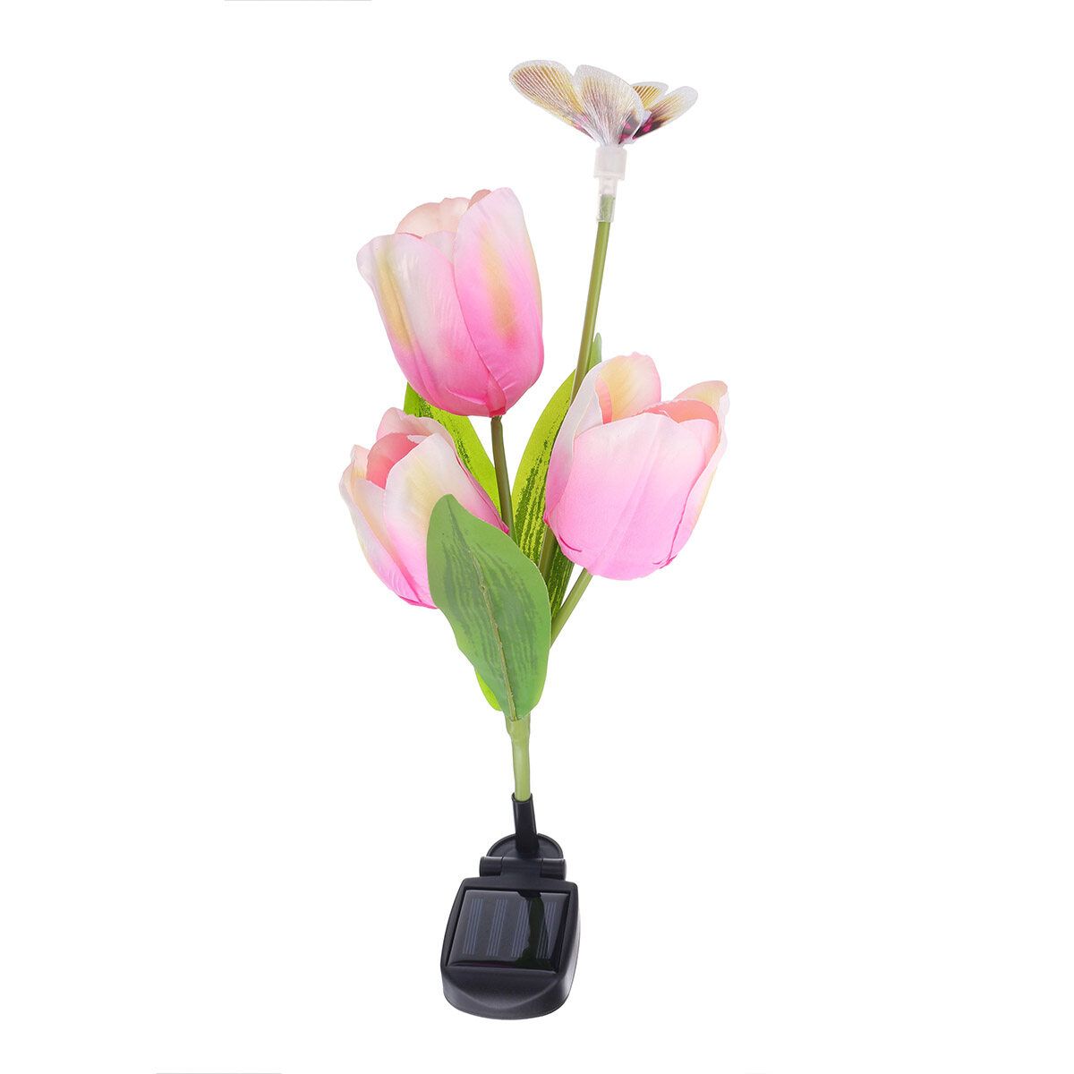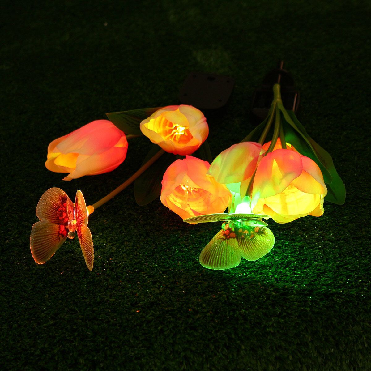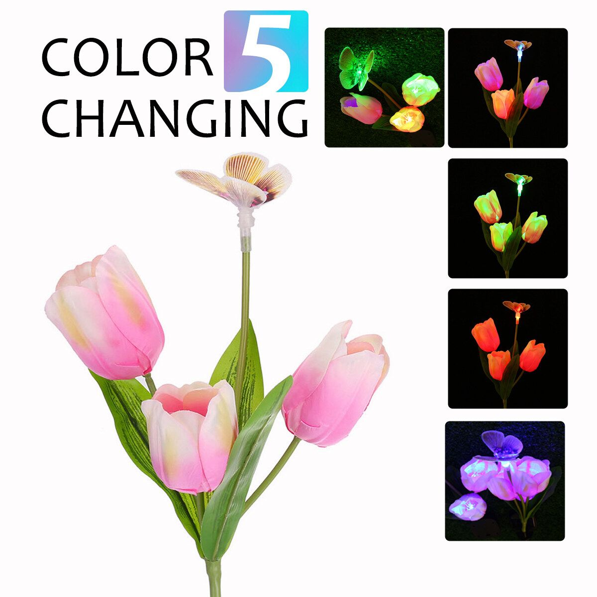 Features:- Changing Solar Garden Light: Flower stake light with -changing. The solar lights automatically lights up in the dark to illuminate your garden and pathway. Perfect as path lights and in-ground lights Suitable for the Garden, Trees, Flowers,Flowerbed, Fence, Walkway, this garden solar lights Does it all.- Adjustable Stems Leaves: Both stems and leaves are propped up by iron wire which gives ultra flexibility and durability. You can bend the solar flowers stems and leaves into different angel and style,and the flower lights will stay in shape even after thousand times of bending.Flowers and leaves will not fade easily even after exposed to the sun.- Enjoy The Beauty: This beautiful Solar flower lights flower garden stake light is at home outside. Let it decorate your garden during the day, convert sunlight into electricity, and when night falls, it will automatically light up to illuminate your garden and pathway.