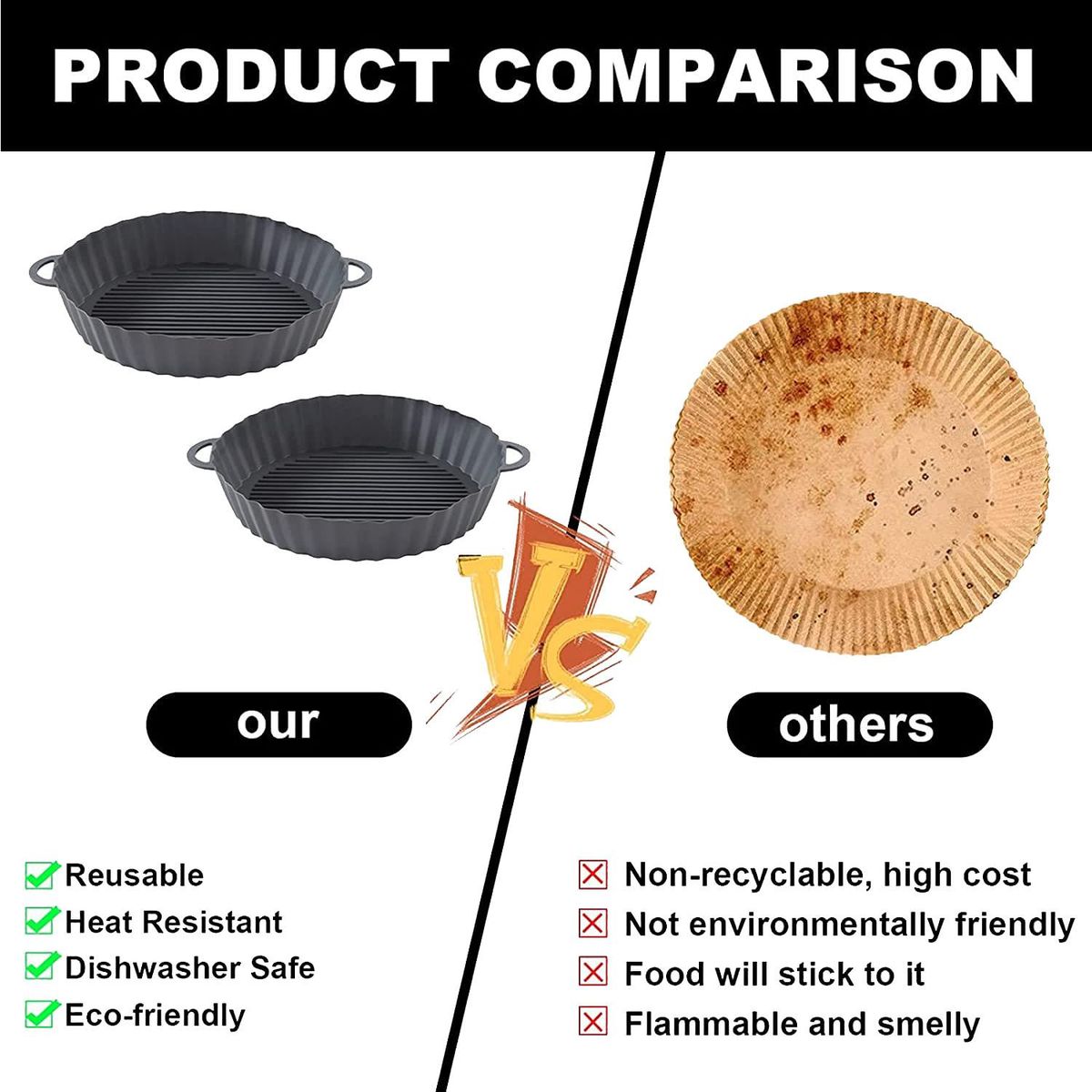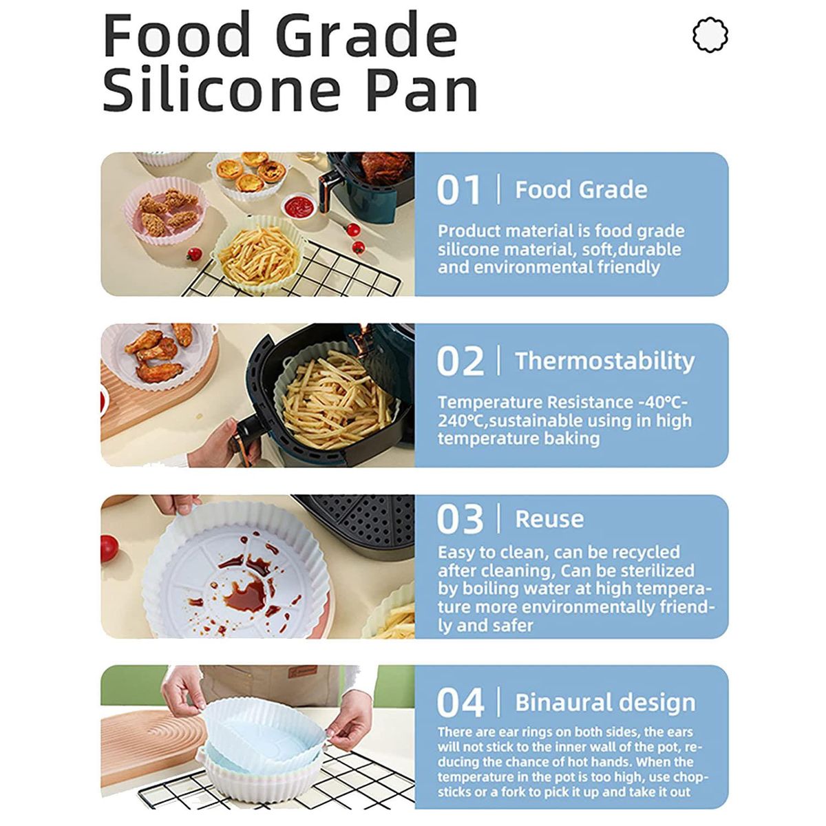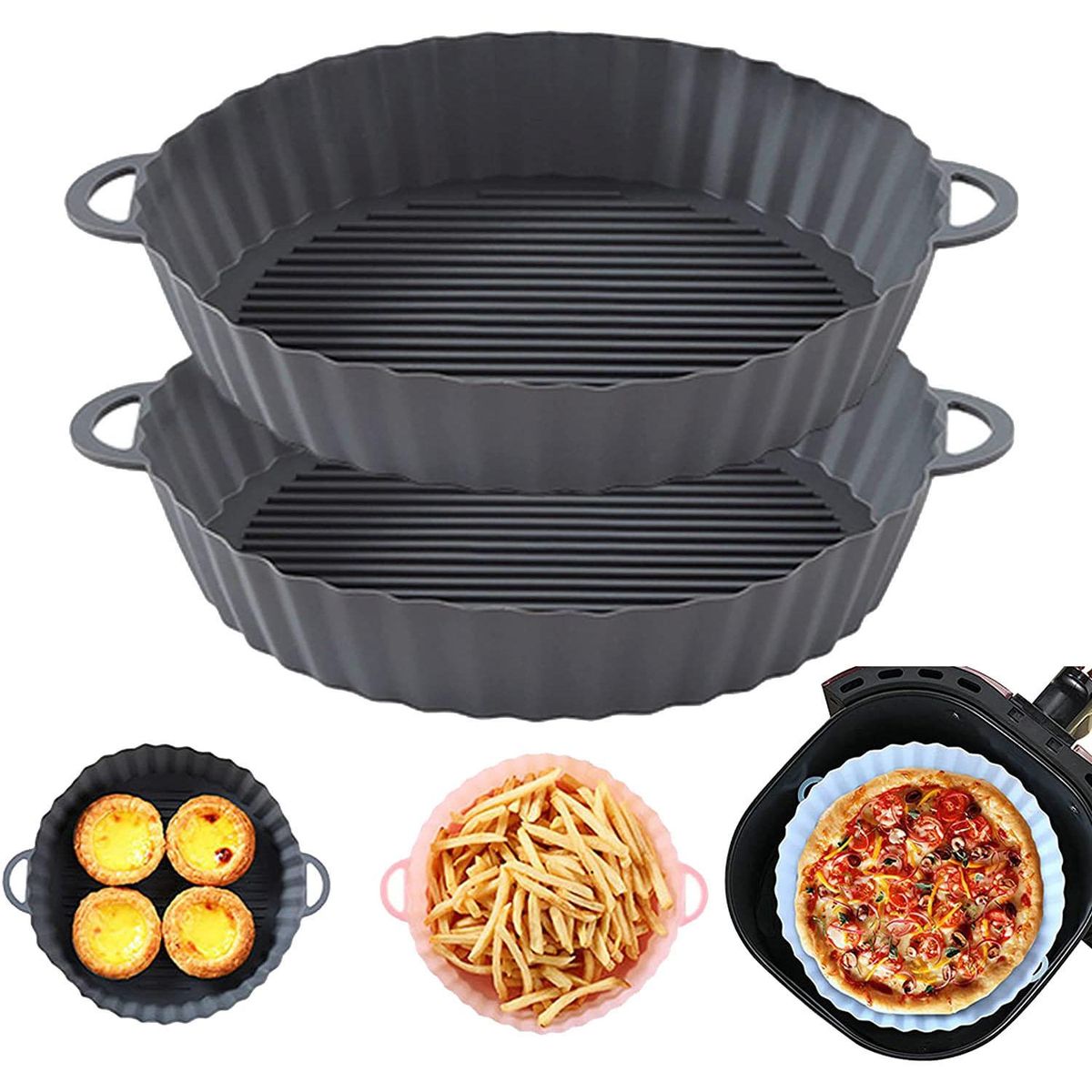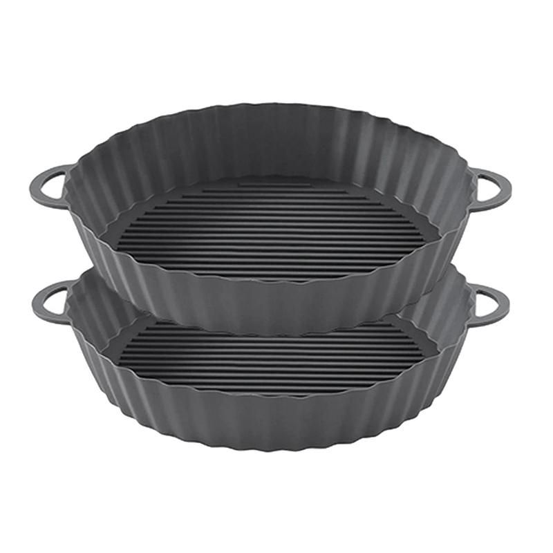 Double-sided and Reusable 2-piece interchangeable and reusable silicone panThe pot is reversible design can be used in reverse more convenient to prepare foodThe bottom pattern is conducive to the air circulation in the fryer