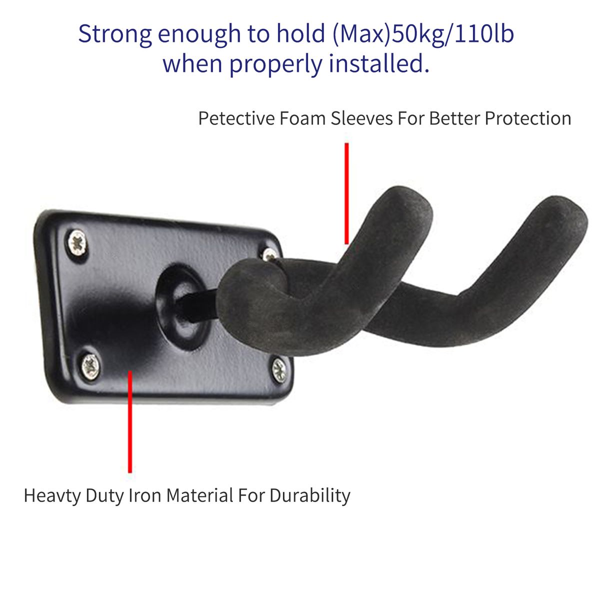 Heavy duty iron hook,strong enough to hold (Max)50kg/110lb when properly installed.