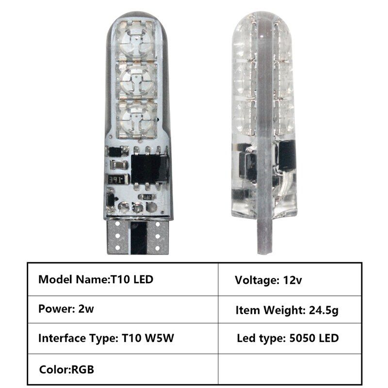 Product model: T10-COB-12smd silica RGB Lamp type: RGB-COB Number of lights: single LED lamp 6SMD Power: 1.3W Power: 12V Product specification: 10*34mm Color: as described by remote control