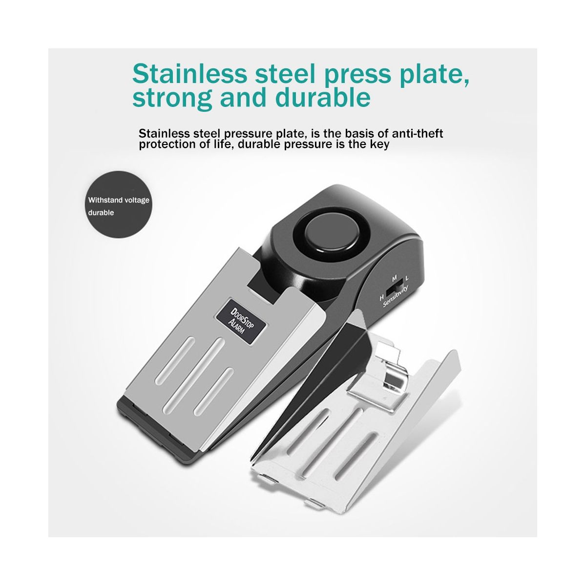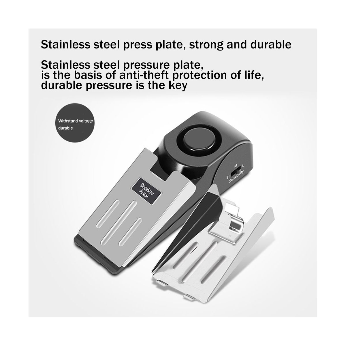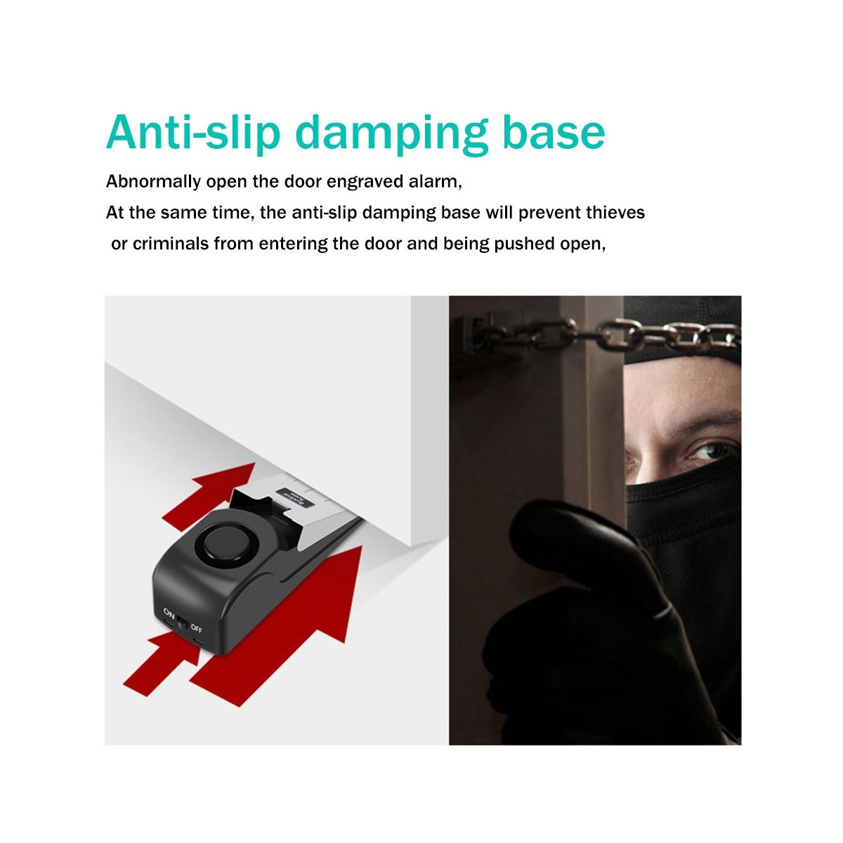 [Function] You can use it as a common door stopper when turn down the ON/OFF switch, hold the the open position. Volume: equal 120(dB)