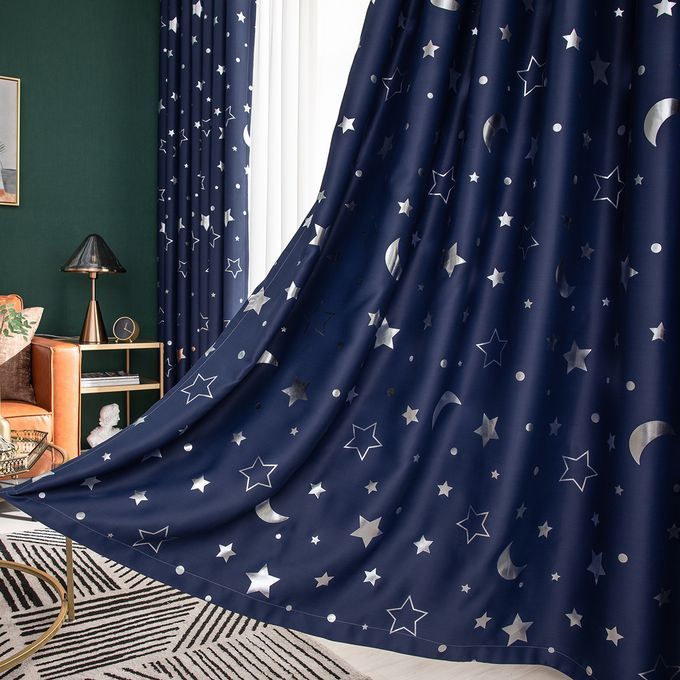 5. This carefully crafted, double-sided curtain has a moon and stars pattern on the front and a plain color palette on the back, with a light-blocking fabric lining.