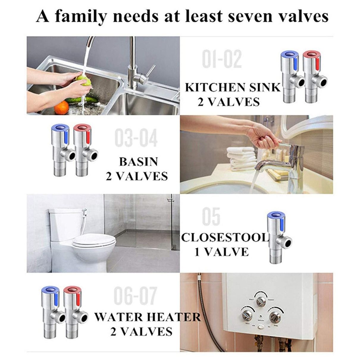 The valves have blue and red mark, blue for cold water pipes, red for hot water pipes. adjust water pressure; also used to check and control home waterways during maintenance.