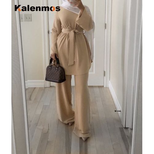 1X 2pecs Set Blouse Wide Leg Pants Women Dubai Muslim Abaya Lace-up Solid Ropa De Mujer Kaftan UAE Islamic Clothing Turkey African