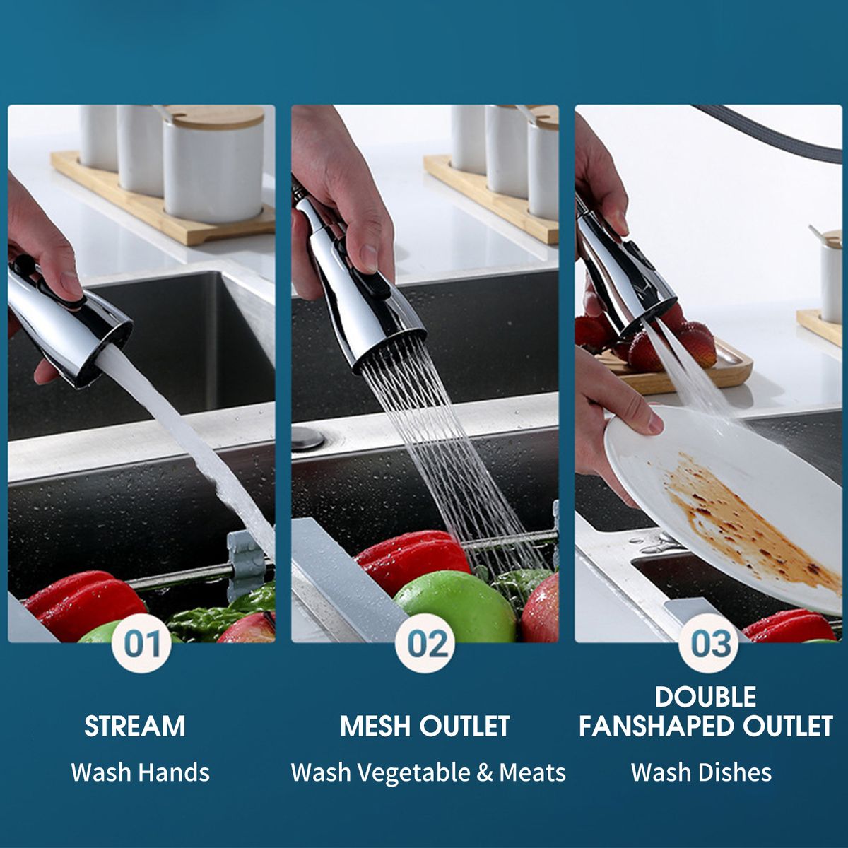 [Three-function Spray Head]Soft stream mode is used regularly. Mesh outlet makes sense in large area cleaning. A double fan-shaped outlet comes when solve flush stuck residue.