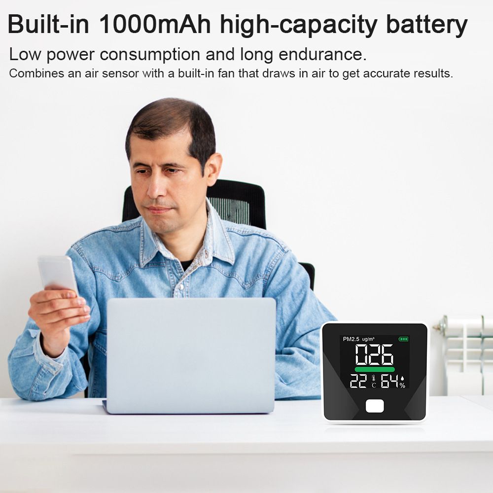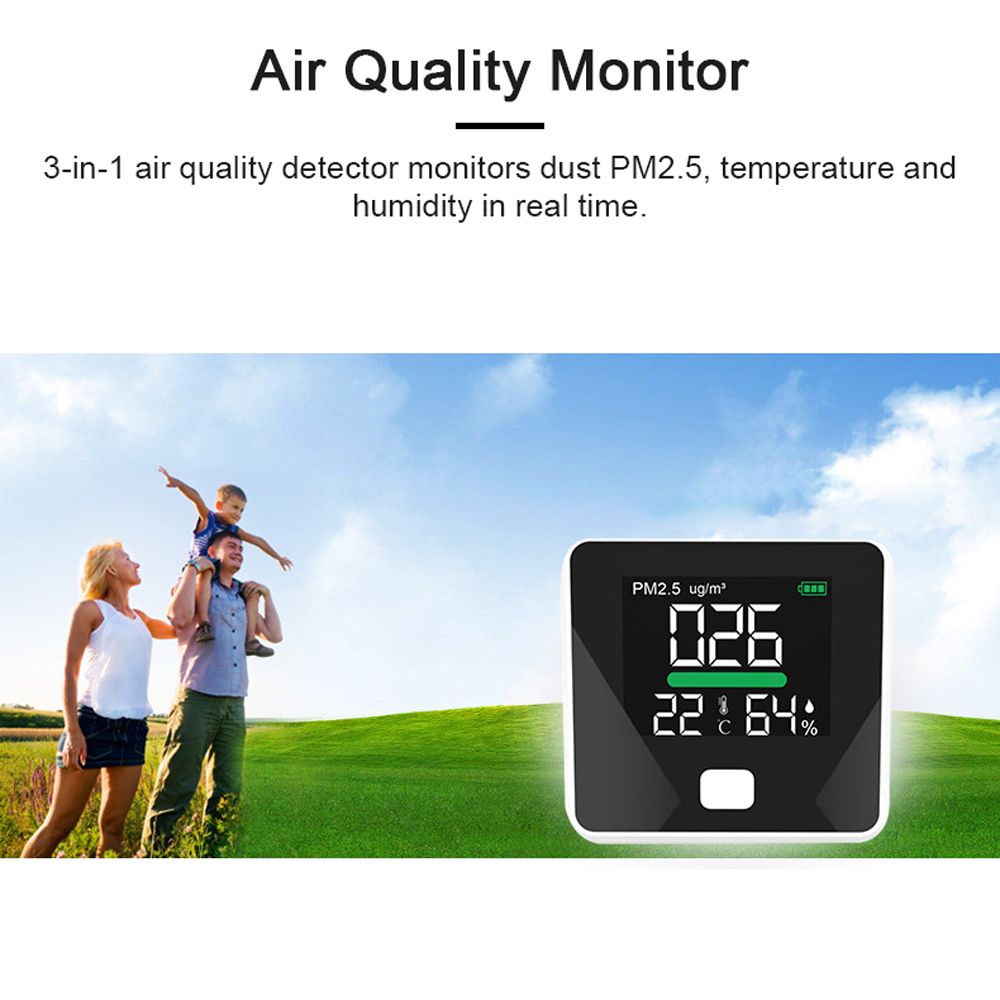 3-in-1 air quality detector monitors dust PM2.5, temperature and humidity in real time.