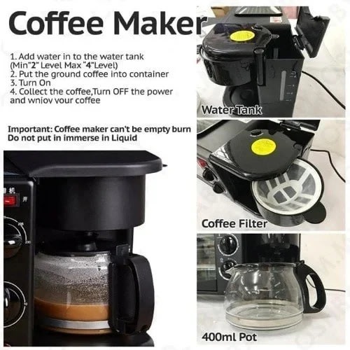 [Three-in-one breakfast machine]: electric oven (9L capacity), coffee machine (600 ml capacity), frying pan, free barbecue, enjoy on different days. Space-saving, compact and versatile design is perfect for any countertop.