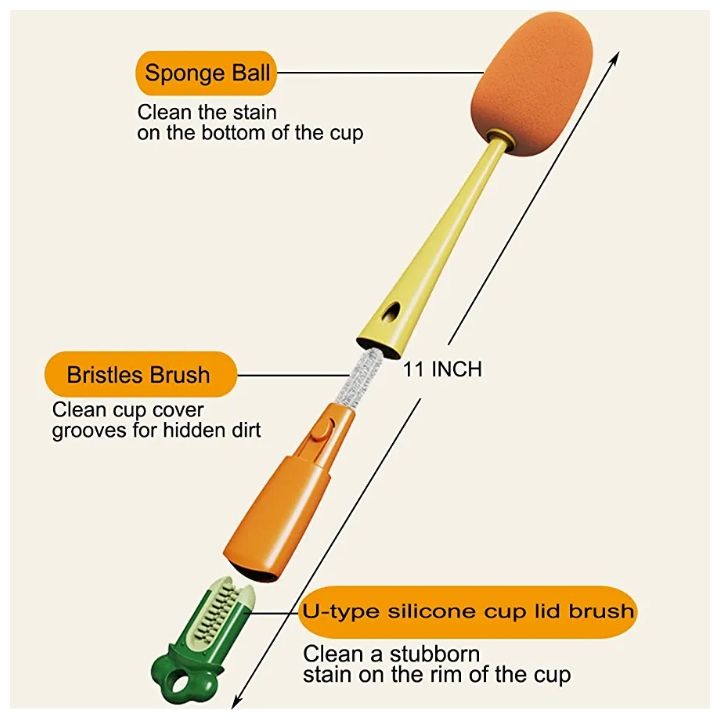 【Triple Cleaning Mode】One bottle cleaner brush with three uses, long-handled multi-function brush. Triple cleaning mode, for different stains for complete and efficient cleaning. Sponge brush head, clean the attached wall cup bottom stains. Gap bristle brush, clean the lid groove hidden dirt. The soft, U-shaped brush cleans a circle of tough stains around the rim of the mug.