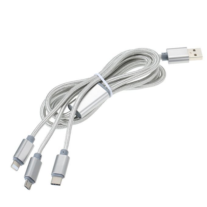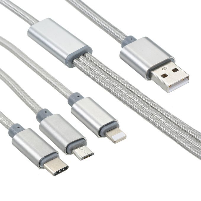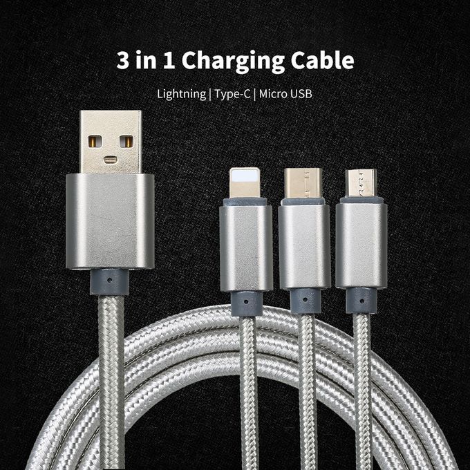 3 in 1 Cable Data Cable 2.4A with Micro USB/Type-c Replacement for iPhone Xiaomi Huawei Samsung Nylon Braided Multiple USB Grey