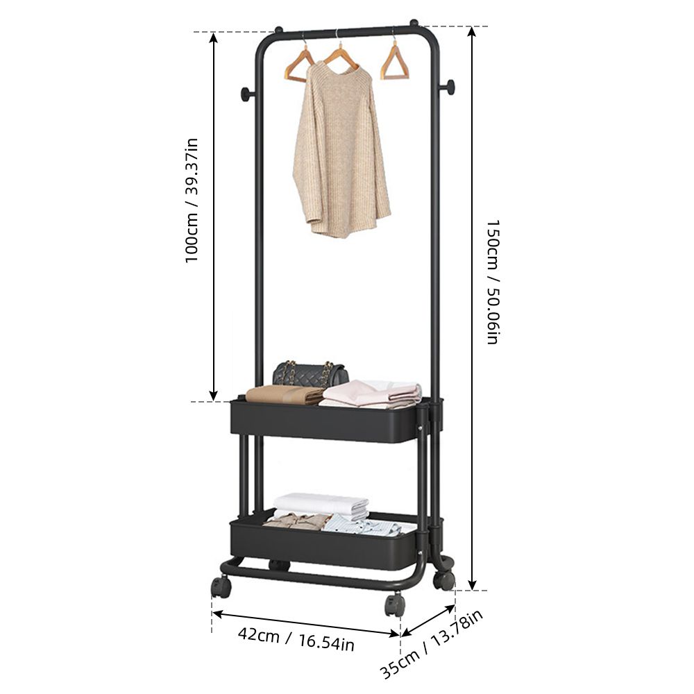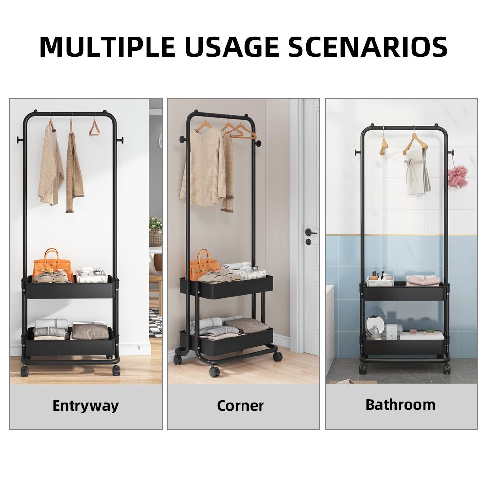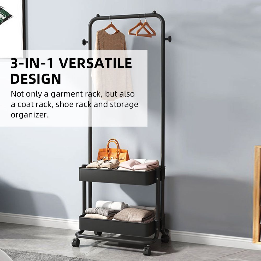 3-IN-1 VERSATILE DESIGN: Equipped with a hanging zone, 2 baskets and 2 cute hooks, this 3 in 1 free standing organizer can serve as coat rack, garment rack, shoe rack, ect. The hanging zone can hang your clothes without getting it crumpled or creased, double baskets provide extra storage for shoes, boxes, folded clothes and hooks for your keys,umbrella,caps, bags and other s.