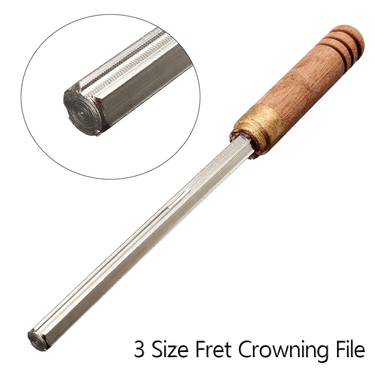 The file has 3 different sizes e-dges, 1mm for narrow frets, 2mm for medium frets and 3mm for wide frets concave file in center.