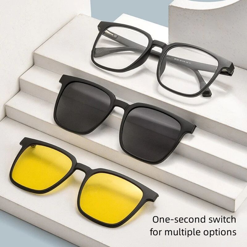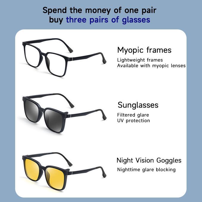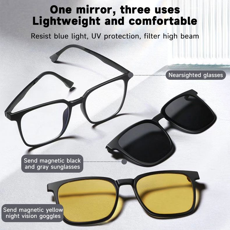 This three in one magnetic glasses is designed by using the principle of magnetic force, which can change glasses at will. It not only solves the above problems, but also its lightweight resin frame design can avoid discomfort caused by wearing glasses all day long