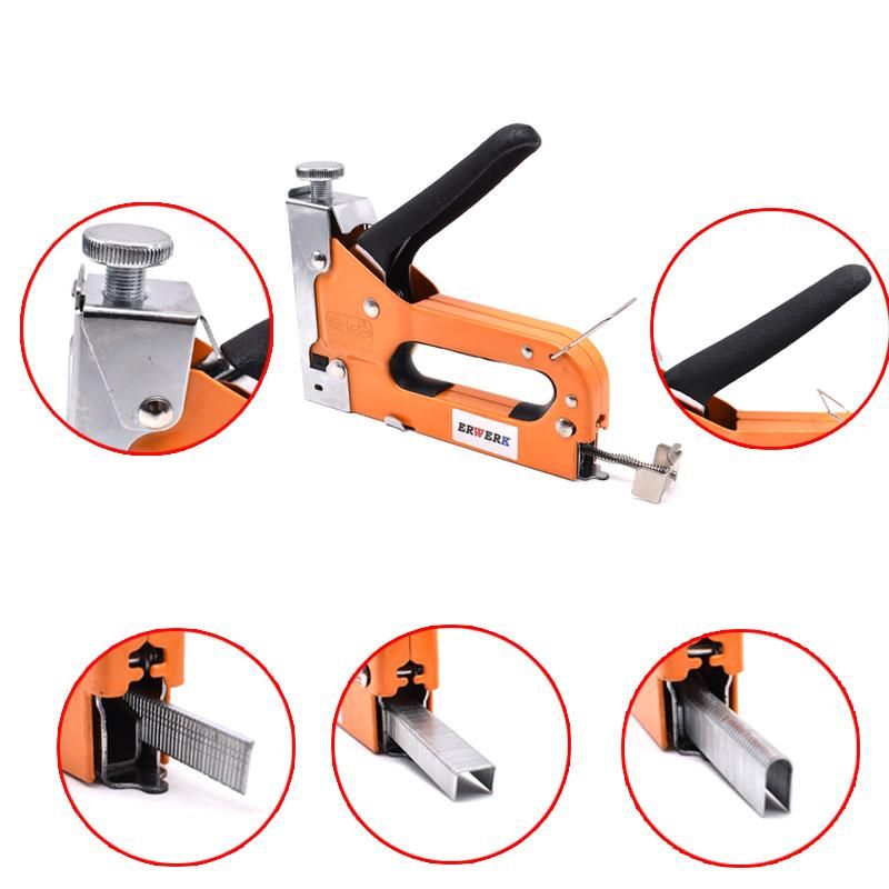 Discription:Made of full steel ,top spring configuration,firm and durable,quick nailed,high strength.portable and easy to operate.This itme is widely used in furniture,leather,wooden case,upy and shoes industry.Package incuding:1. 1PCS Nail Gun2. 200pcs Door-nail3. 200pcs T-nail4. 200pcs U-nailThe stapler gun fit to frame staple(4-14mm),round staple (10-12mm) and finish nail(10-14mm)