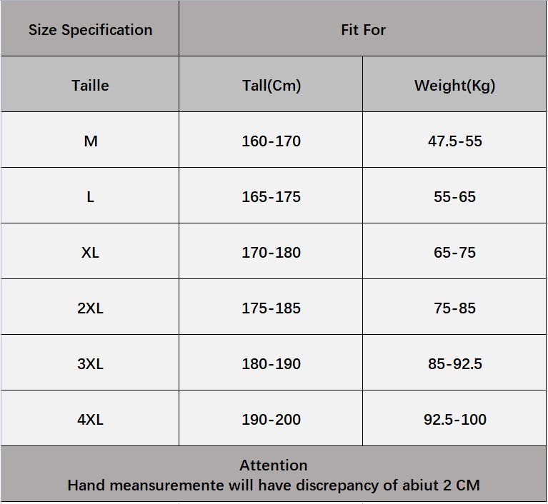 Recommended size:M code: 47.5kg—55kg 160-170cmL code: 55kg—65kg 165-175cm
