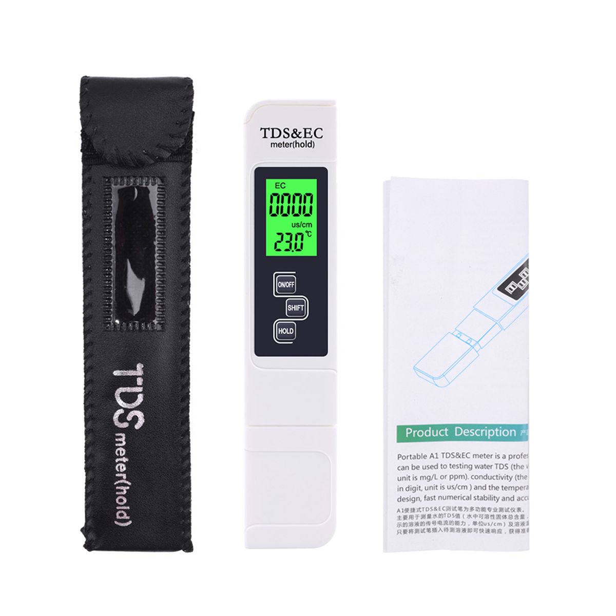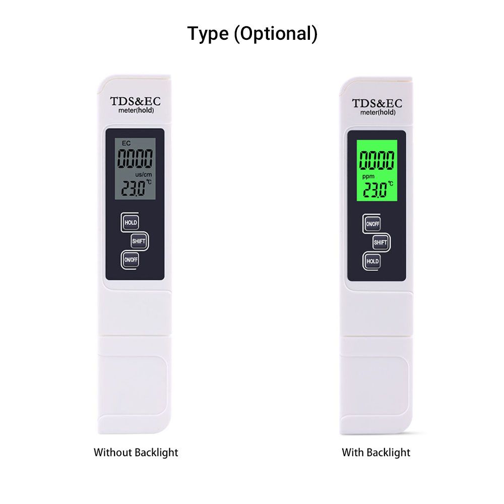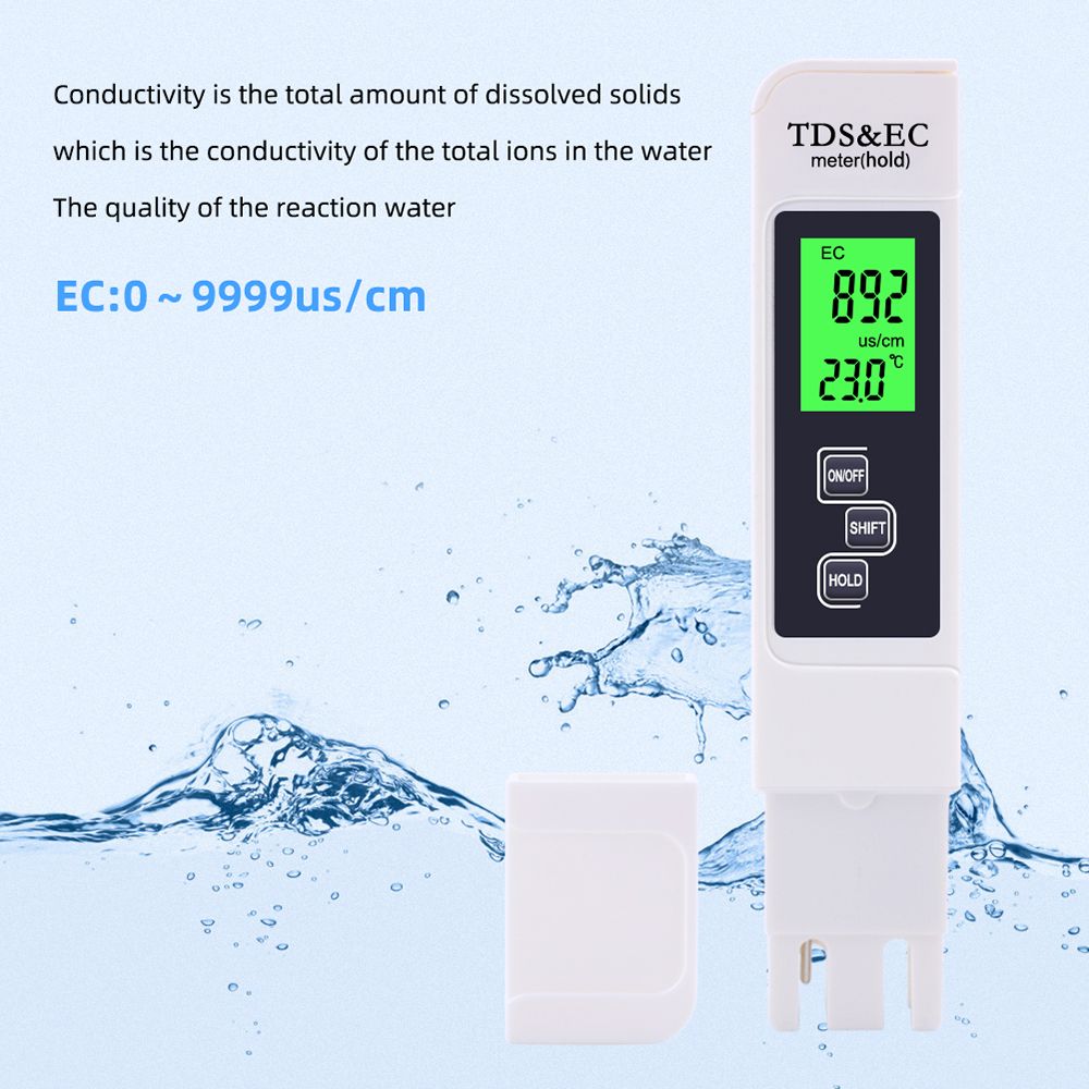 3-in-1 digital TDS meter provides accurate readings for TDS (Total Dissolved Solids), EC (Electrical Conductivity), and temperature.
